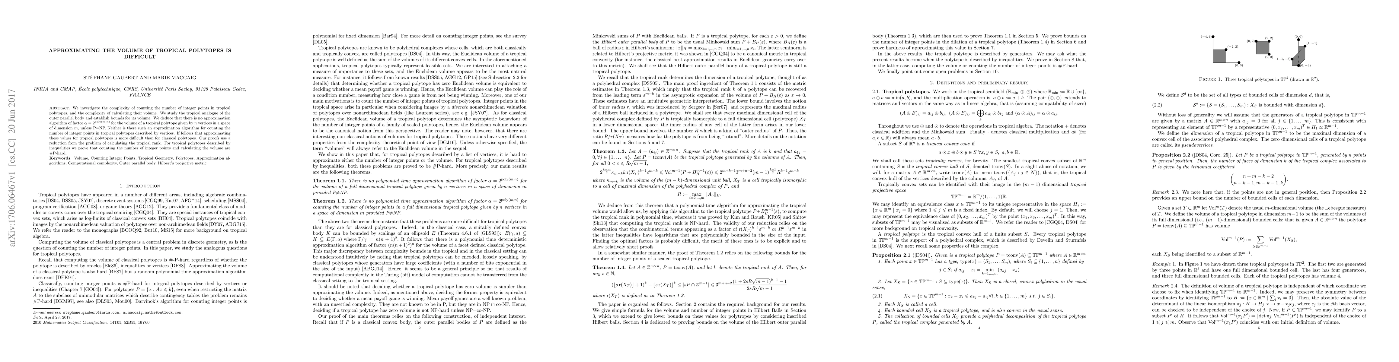 This paper demonstrates that approximating the volume and counting integer points in tropical polytopes is computationally intractable, proving that no efficient approximation algorithm exists unless P=NP. It establishes that these problems are more challenging than their classical counterparts.