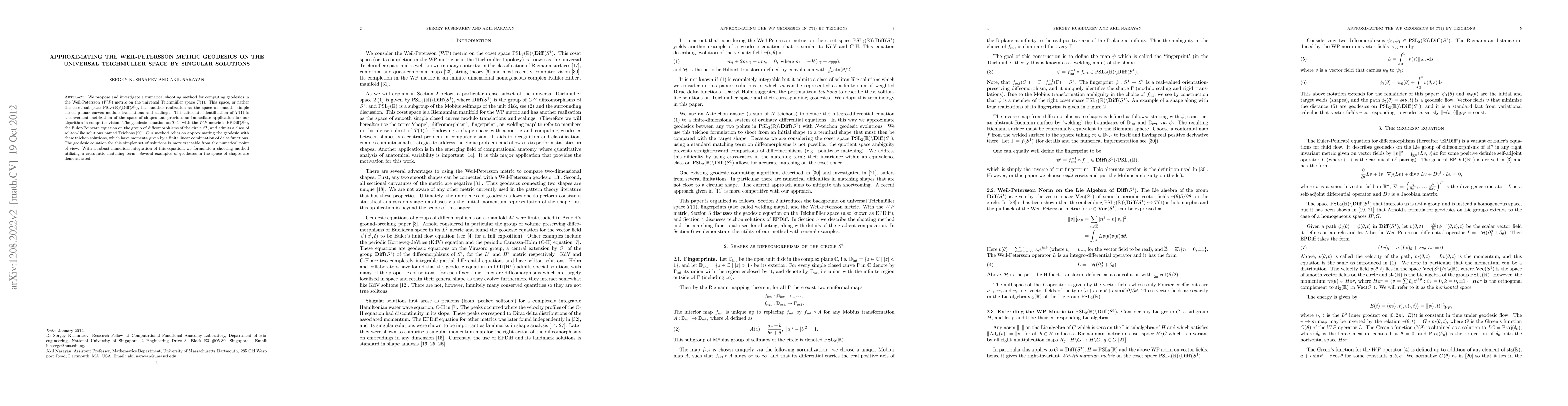 We propose and investigate a numerical shooting method for computing geodesics in the Weil-Petersson ($WP$) metric on the universal Teichm\"uller space T(1). This space, or rather the coset subspace $\PSL_2(\R)\backslash\Diff(S^1)$, has another realization as the space of smooth, simple closed planar curves modulo translations and scalings. This alternate identification of T(1) is a convenient metrization of the space of shapes and provides an immediate application for our algorithm in computer vision. The geodesic equation on T(1) with the $WP$ metric is EPDiff($S^1$), the Euler-Poincare equation on the group of diffeomorphisms of the circle $S^1$, and admits a class of soliton-like solutions named Teichons. Our method relies on approximating the geodesic with these teichon solutions, which have momenta given by a finite linear combination of delta functions. The geodesic equation for this simpler set of solutions is more tractable from the numerical point of view. With a robust numerical integration of this equation, we formulate a shooting method utilizing a cross-ratio matching term. Several examples of geodesics in the space of shapes are demonstrated.