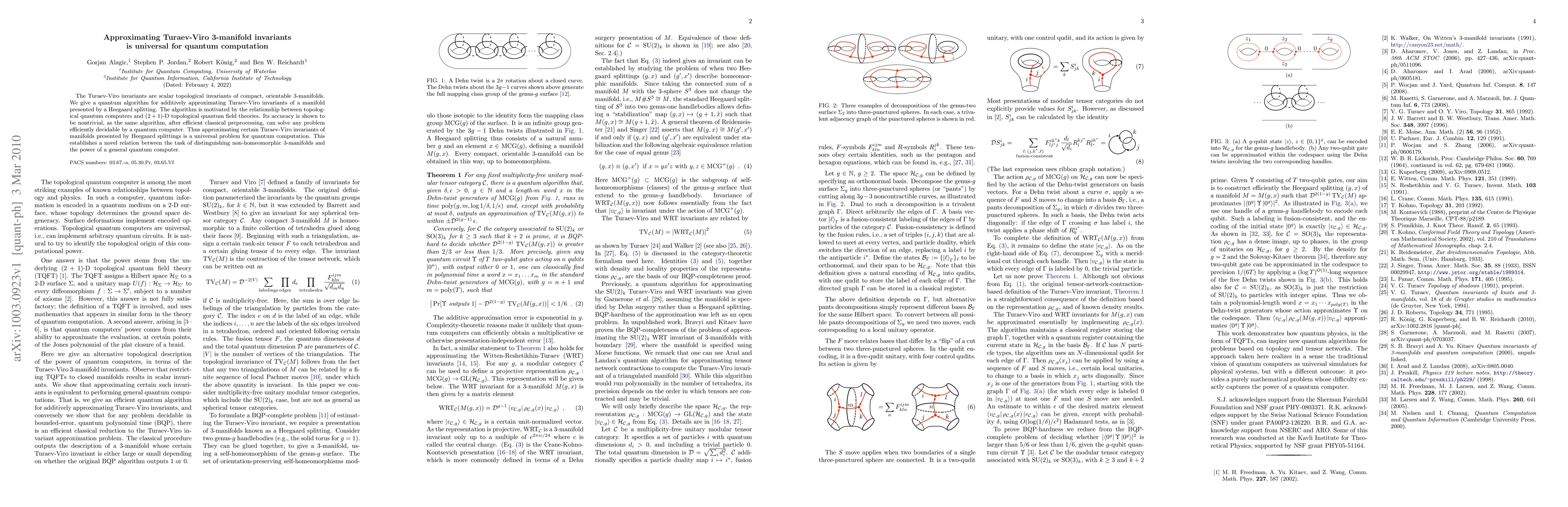The paper presents a quantum algorithm for approximating Turaev-Viro invariants, demonstrating its universality for quantum computation by showing it can solve any problem efficiently decidable by a quantum computer. This establishes a novel link between distinguishing 3-manifolds and the computational power of quantum computing.