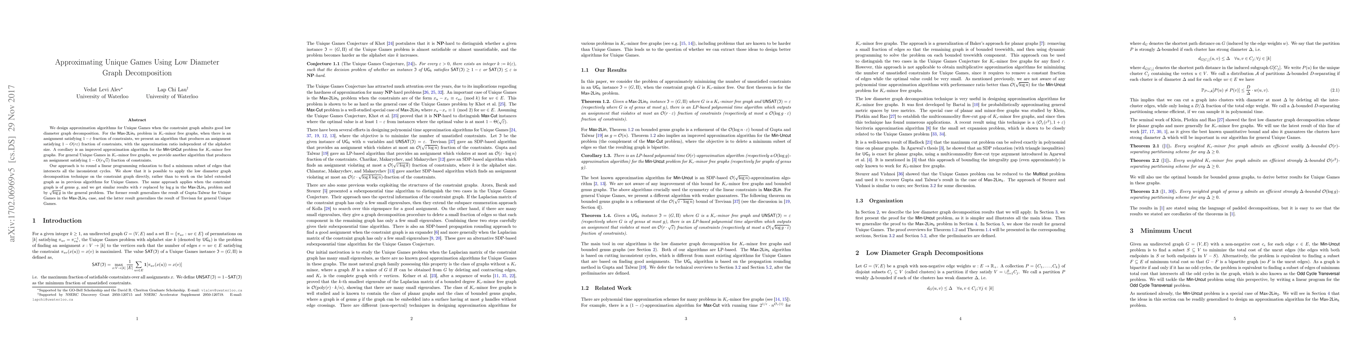 This paper presents approximation algorithms for Unique Games on $K_r$-minor free graphs using low diameter graph decomposition, achieving better results than previous methods. It improves the approximation ratio for ${\sf Max2Lin}_k$ and ${\sf MaxCut}$ problems, and generalizes results for Unique Games in graphs of genus $g$.