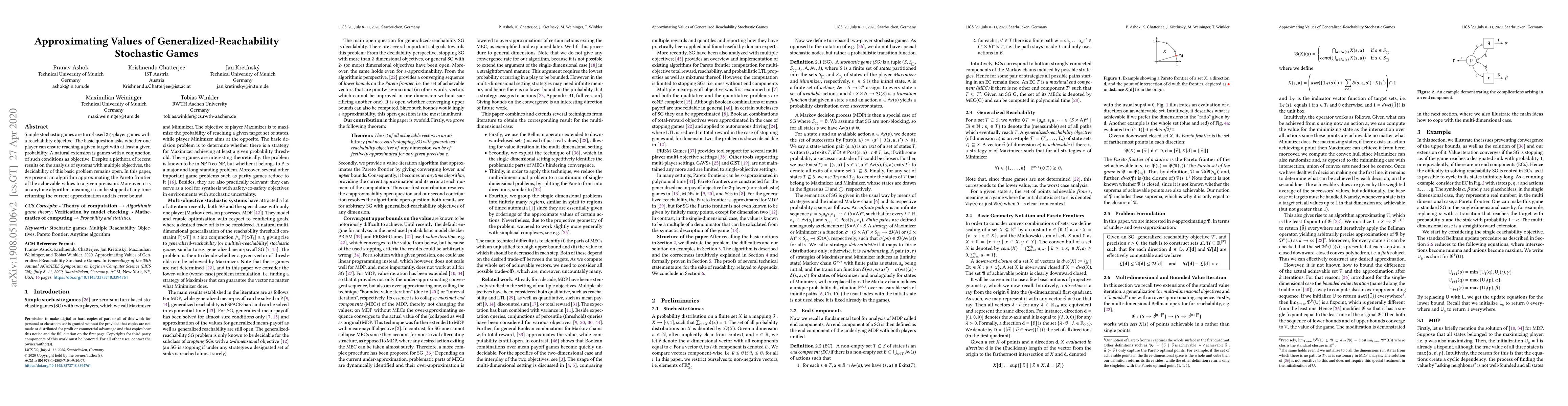 A new algorithm approximates the Pareto frontier of achievable values in generalized-reachability stochastic games to a given precision, providing an anytime solution with error bounds.