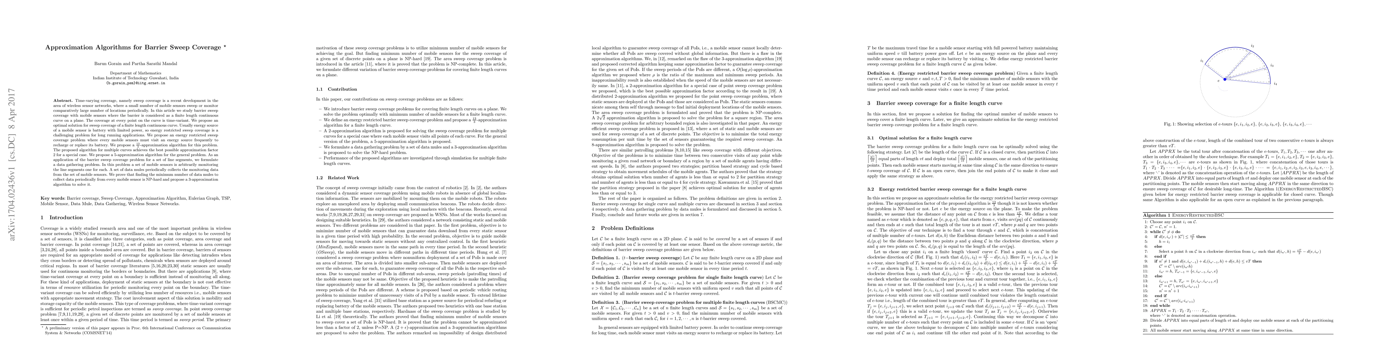 This paper explores optimization algorithms for barrier sweep coverage in wireless sensor networks, focusing on energy-restricted scenarios. It proposes an optimal solution and approximation algorithms for covering finite curves, with a $\frac{13}{3}$-approximation for general cases and a 2-approximation for special cases. Additionally, it addresses a data gathering problem involving mobile sensors and data mules, proving its NP-hardness and proposing a 3-approximation algorithm.