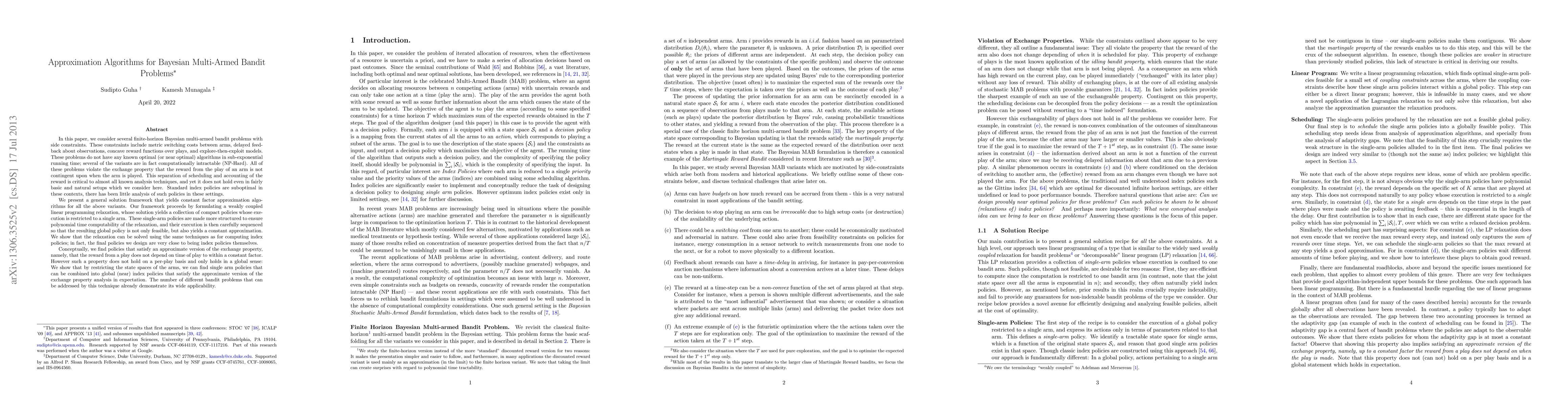 This paper explores approximation algorithms for NP-Hard Bayesian multi-armed bandit problems with side constraints. It proposes that near-optimal policies, particularly those satisfying an approximate exchange property, can lead to effective global (near) index policies, despite the violation of standard properties in these settings.