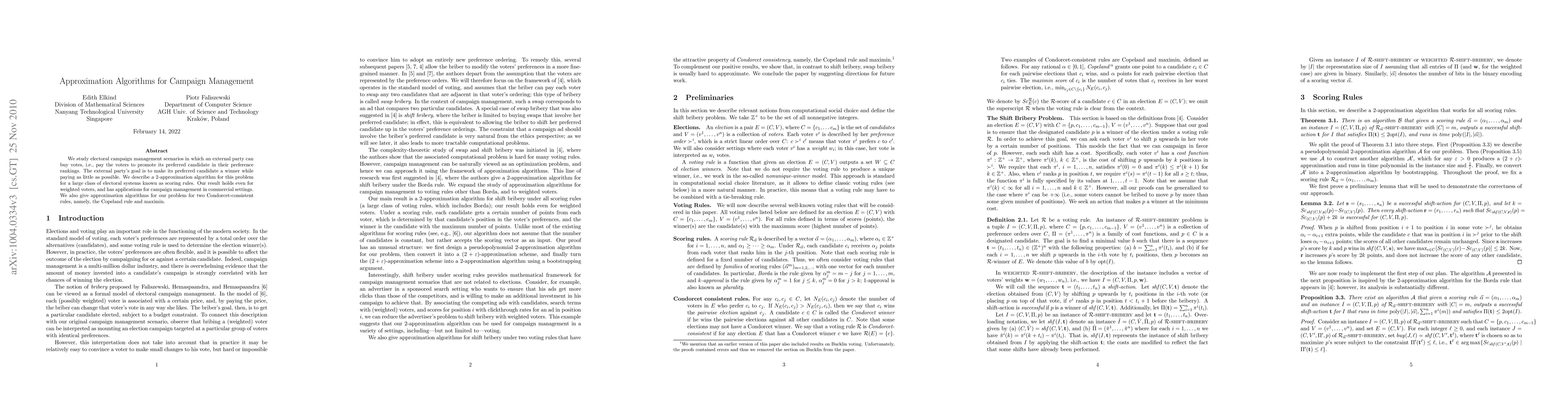We study electoral campaign management scenarios in which an external party can buy votes, i.e., pay the voters to promote its preferred candidate in their preference rankings. The external party's goal is to make its preferred candidate a winner while paying as little as possible. We describe a 2-approximation algorithm for this problem for a large class of electoral systems known as scoring rules. Our result holds even for weighted voters, and has applications for campaign management in commercial settings. We also give approximation algorithms for our problem for two Condorcet-consistent rules, namely, the Copeland rule and maximin.