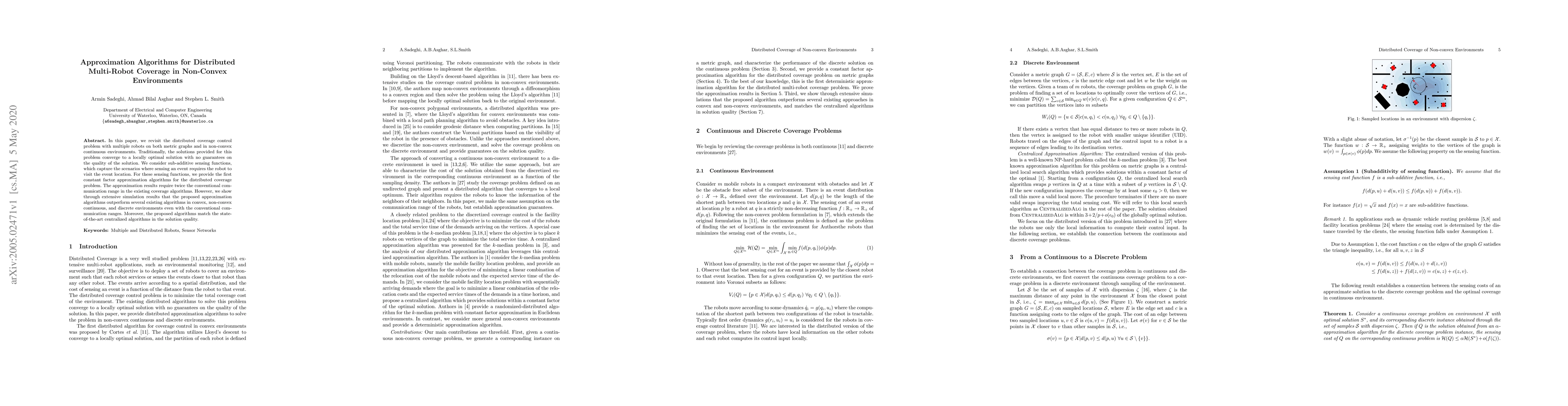In this paper, we revisit the distributed coverage control problem with multiple robots on both metric graphs and in non-convex continuous environments. Traditionally, the solutions provided for this problem converge to a locally optimal solution with no guarantees on the quality of the solution. We consider sub-additive sensing functions, which capture the scenarios where sensing an event requires the robot to visit the event location. For these sensing functions, we provide the first constant factor approximation algorithms for the distributed coverage problem. The approximation results require twice the conventional communication range in the existing coverage algorithms. However, we show through extensive simulation results that the proposed approximation algorithms outperform several existing algorithms in convex, non-convex continuous, and discrete environments even with the conventional communication ranges. Moreover, the proposed algorithms match the state-of-the-art centralized algorithms in the solution quality.