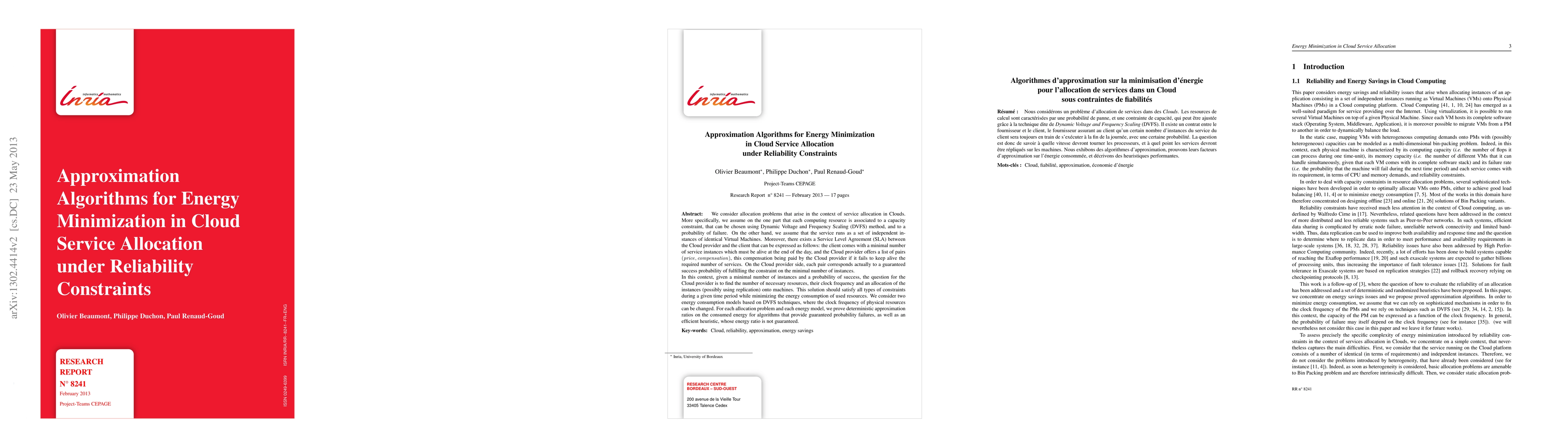 We consider allocation problems that arise in the context of service allocation in Clouds. More specifically, we assume on the one part that each computing resource is associated to a capacity constraint, that can be chosen using Dynamic Voltage and Frequency Scaling (DVFS) method, and to a probability of failure. On the other hand, we assume that the service runs as a set of independent instances of identical Virtual Machines. Moreover, there exists a Service Level Agreement (SLA) between the Cloud provider and the client that can be expressed as follows: the client comes with a minimal number of service instances which must be alive at the end of the day, and the Cloud provider offers a list of pairs (price,compensation), this compensation being paid by the Cloud provider if it fails to keep alive the required number of services. On the Cloud provider side, each pair corresponds actually to a guaranteed success probability of fulfilling the constraint on the minimal number of instances. In this context, given a minimal number of instances and a probability of success, the question for the Cloud provider is to find the number of necessary resources, their clock frequency and an allocation of the instances (possibly using replication) onto machines. This solution should satisfy all types of constraints during a given time period while minimizing the energy consumption of used resources. We consider two energy consumption models based on DVFS techniques, where the clock frequency of physical resources can be changed. For each allocation problem and each energy model, we prove deterministic approximation ratios on the consumed energy for algorithms that provide guaranteed probability failures, as well as an efficient heuristic, whose energy ratio is not guaranteed.