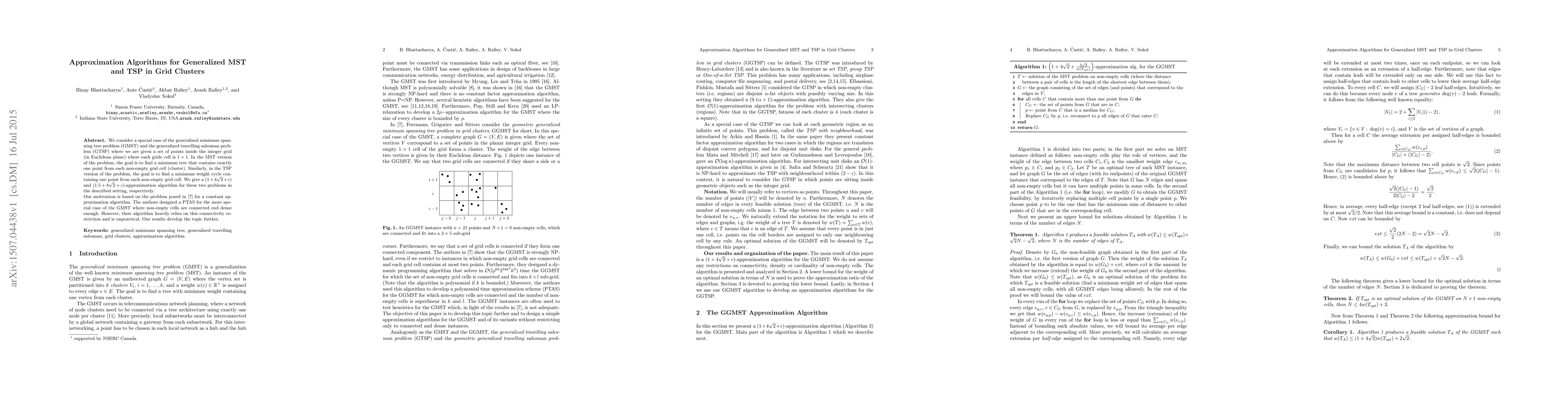 We consider a special case of the generalized minimum spanning tree problem (GMST) and the generalized travelling salesman problem (GTSP) where we are given a set of points inside the integer grid (in Euclidean plane) where each grid cell is $1 \times 1$. In the MST version of the problem, the goal is to find a minimum tree that contains exactly one point from each non-empty grid cell (cluster). Similarly, in the TSP version of the problem, the goal is to find a minimum weight cycle containing one point from each non-empty grid cell. We give a $(1+4\sqrt{2}+\epsilon)$ and $(1.5+8\sqrt{2}+\epsilon)$-approximation algorithm for these two problems in the described setting, respectively. Our motivation is based on the problem posed in [7] for a constant approximation algorithm. The authors designed a PTAS for the more special case of the GMST where non-empty cells are connected end dense enough. However, their algorithm heavily relies on this connectivity restriction and is unpractical. Our results develop the topic further.
