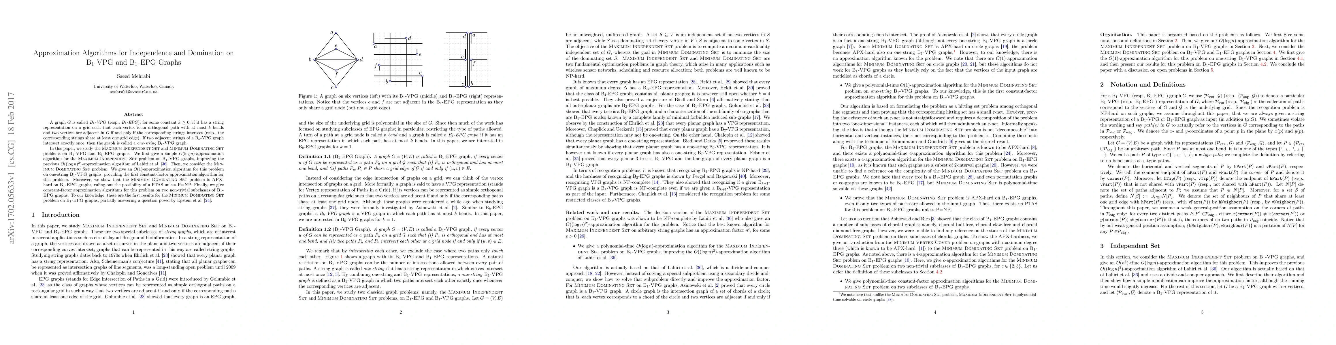 A graph $G$ is called B$_k$-VPG (resp., B$_k$-EPG), for some constant $k\geq 0$, if it has a string representation on a grid such that each vertex is an orthogonal path with at most $k$ bends and two vertices are adjacent in $G$ if and only if the corresponding strings intersect (resp., the corresponding strings share at least one grid edge). If two adjacent strings of a B$_k$-VPG graph intersect exactly once, then the graph is called a one-string B$_k$-VPG graph. In this paper, we study the Maximum Independent Set and Minimum Dominating Set problems on B$_1$-VPG and B$_1$-EPG graphs. We first give a simple $O(\log n)$-approximation algorithm for the Maximum Independent Set problem on B$_1$-VPG graphs, improving the previous $O((\log n)^2)$-approximation algorithm of Lahiri et al. (COCOA 2015). Then, we consider the Minimum Dominating Set problem. We give an $O(1)$-approximation algorithm for this problem on one-string B$_1$-VPG graphs, providing the first constant-factor approximation algorithm for this problem. Moreover, we show that the Minimum Dominating Set problem is APX-hard on B$_1$-EPG graphs, ruling out the possibility of a PTAS unless P=NP. Finally, we give constant-factor approximation algorithms for this problem on two non-trivial subclasses of B$_1$-EPG graphs. To our knowledge, these are the first results for the Minimum Dominating Set problem on B$_1$-EPG graphs, partially answering a question posed by Epstein et al. (WADS 2013).