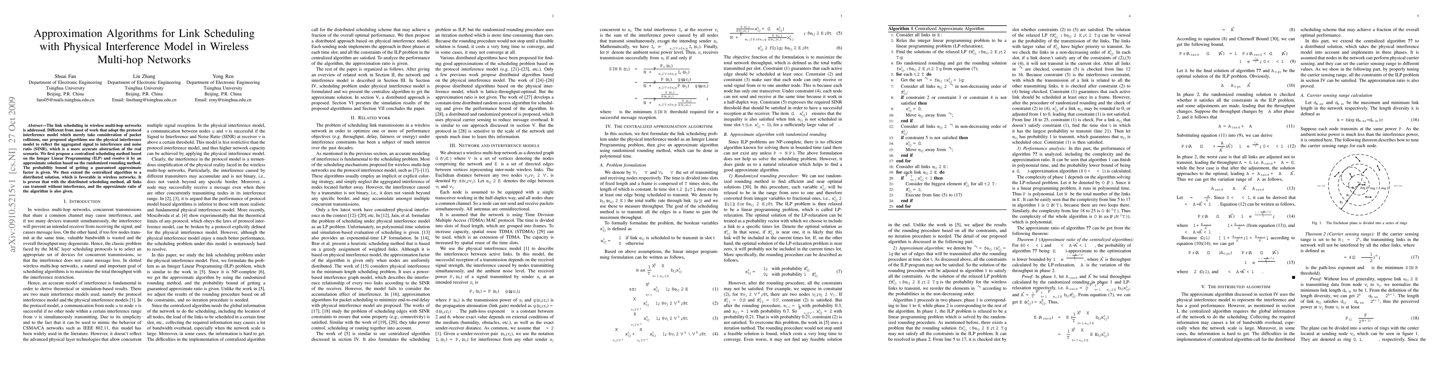 This paper proposes approximation algorithms for link scheduling in wireless multi-hop networks using the physical interference model, rather than the protocol interference model. It introduces a centralized method based on Integer Linear Programming and extends it to a distributed version, ensuring interference-free transmission with given approximate ratios.