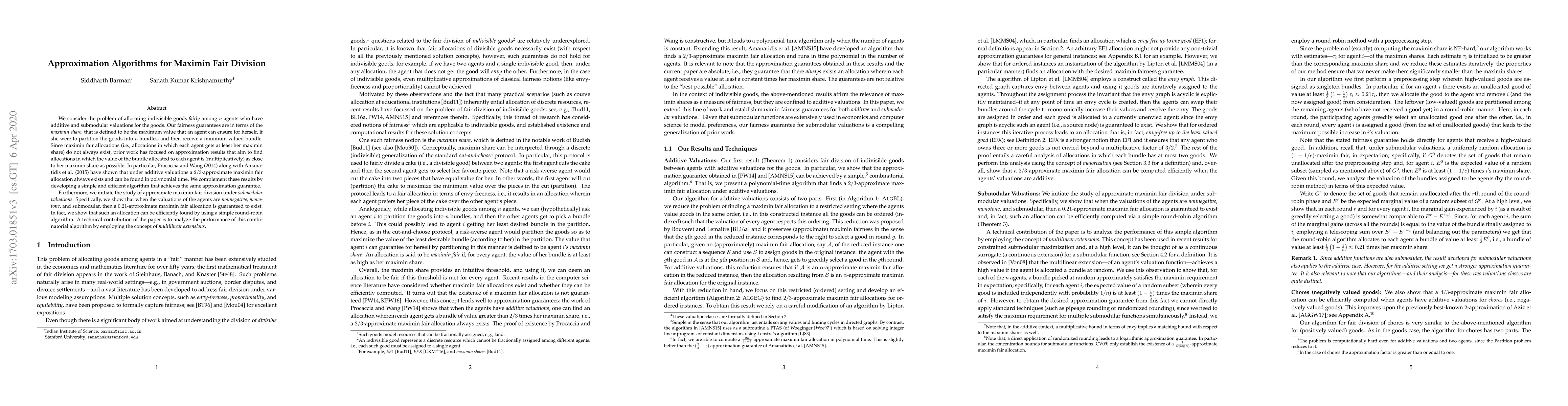 The paper presents approximation algorithms for maximizing the minimax share in fair division of indivisible goods with additive and submodular valuations, complementing and improving upon previous work by Procaccia and Wang (2014) and Amanatidis et al. (2015).