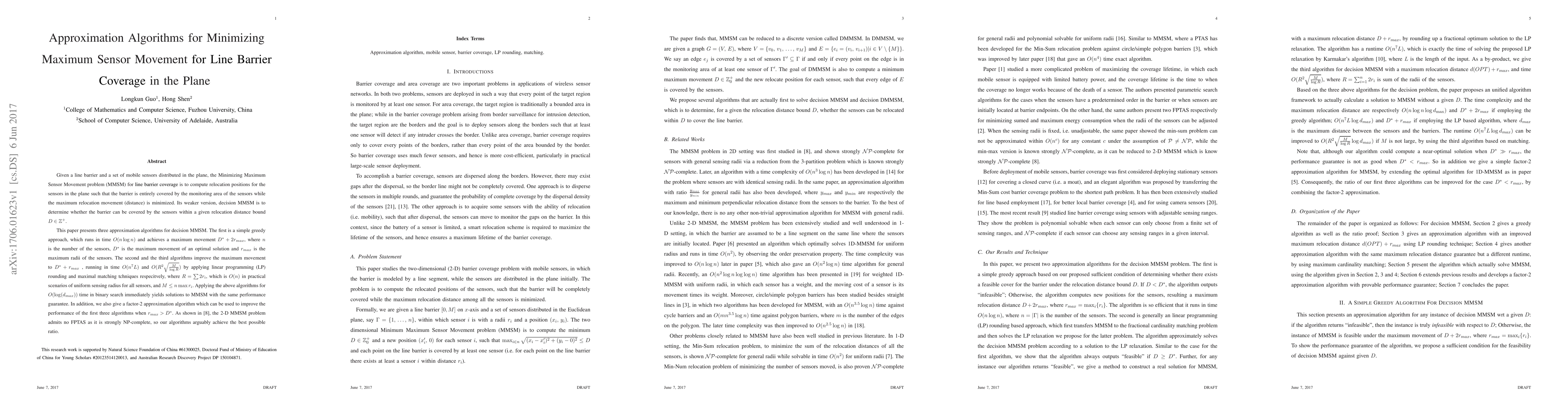 Given a line barrier and a set of mobile sensors distributed in the plane, the Minimizing Maximum Sensor Movement problem (MMSM) for \textcolor{black}{line barrier coverage} is to compute relocation positions for the sensors in the plane such that the barrier is entirely covered by the monitoring area of the sensors while the maximum relocation movement (distance) is minimized. Its weaker version, decision MMSM is to determine whether the barrier can be covered by the sensors within a given relocation distance bound $D\in\mathbb{Z}^{+}$. This paper presents three approximation algorithms for decision MMSM. The first is a simple greedy approach, which runs in time $O(n\log n)$ and achieves a maximum movement $D^{*}+2r_{max}$, where $n$ is the number of the sensors, $D^{*}$ is the maximum movement of an optimal solution and $r_{max}$ is the maximum radii of the sensors. The second and the third algorithms improve the maximum movement to $D^{*}+r_{max}$ , running in time $O(n^{7}L)$ and $O(R^{2}\sqrt{\frac{M}{\log R}})$ by applying linear programming (LP) rounding and maximal matching tchniques respecitvely, where $R=\sum2r_{i}$, which is $O(n)$ in practical scenarios of uniform sensing radius for all sensors, and $M\leq n\max r_{i}$. Applying the above algorithms for $O(\log(d_{max}))$ time in binary search immediately yields solutions to MMSM with the same performance guarantee. In addition, we also give a factor-2 approximation algorithm which can be used to improve the performance of the first three algorithms when $r_{max}>D^{*}$. As shown in \cite{dobrev2015complexity}, the 2-D MMSM problem admits no FPTAS as it is strongly NP-complete, so our algorithms arguably achieve the best possible ratio.