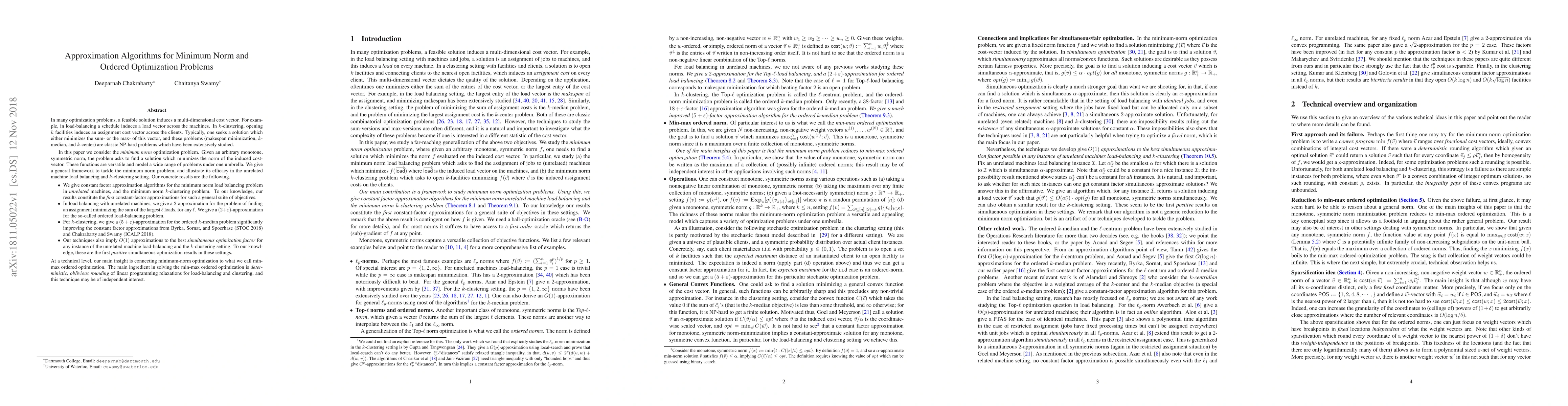 $ $In many optimization problems, a feasible solution induces a multi-dimensional cost vector. For example, in load-balancing a schedule induces a load vector across the machines. In $k$-clustering, opening $k$ facilities induces an assignment cost vector across the clients. In this paper we consider the following minimum norm optimization problem : Given an arbitrary monotone, symmetric norm, find a solution which minimizes the norm of the induced cost-vector. This generalizes many fundamental NP-hard problems. We give a general framework to tackle the minimum norm problem, and illustrate its efficacy in the unrelated machine load balancing and $k$-clustering setting. Our concrete results are the following. $\bullet$ We give constant factor approximation algorithms for the minimum norm load balancing problem in unrelated machines, and the minimum norm $k$-clustering problem. To our knowledge, our results constitute the first constant-factor approximations for such a general suite of objectives. $\bullet$ In load balancing with unrelated machines, we give a $2$-approximation for the problem of finding an assignment minimizing the sum of the largest $\ell$ loads, for any $\ell$. We give a $(2+\varepsilon)$-approximation for the so-called ordered load-balancing problem. $\bullet$ For $k$-clustering, we give a $(5+\varepsilon)$-approximation for the ordered $k$-median problem significantly improving the constant factor approximations from Byrka, Sornat, and Spoerhase (STOC 2018) and Chakrabarty and Swamy (ICALP 2018). $\bullet$ Our techniques also imply $O(1)$ approximations to the best simultaneous optimization factor for any instance of the unrelated machine load-balancing and the $k$-clustering setting. To our knowledge, these are the first positive simultaneous optimization results in these settings.