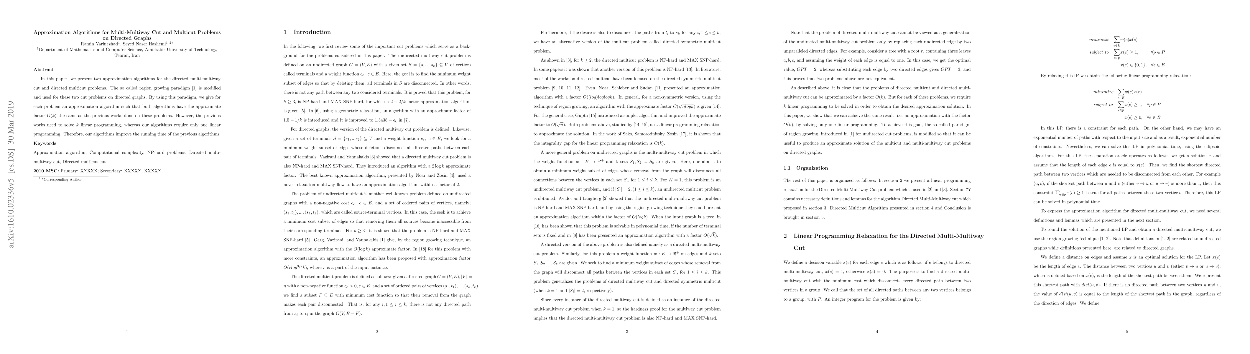 In this paper, we present two approximation algorithms for the directed multi-multiway cut and directed multicut problems. The so called region growing paradigm \cite{1} is modified and used for these two cut problems on directed graphs. By using this paradigm, we give for each problem an approximation algorithm such that both algorithms have the approximate factor $O(k)$ the same as the previous works done on these problems. However, the previous works need to solve $k$ linear programming, whereas our algorithms require only one linear programming. Therefore, our algorithms improve the running time of the previous algorithms.