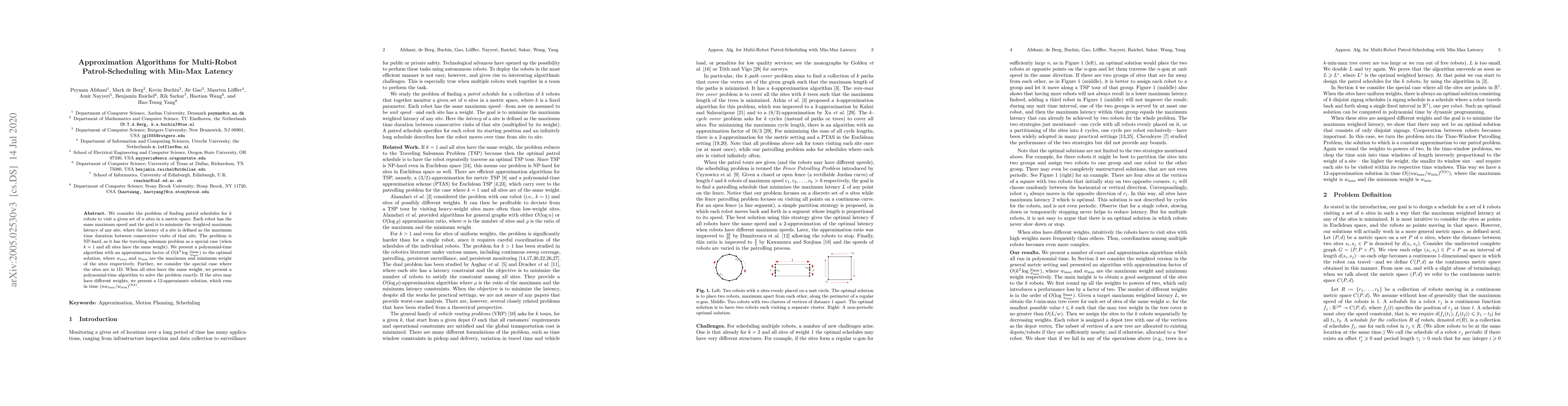 Researchers developed approximation algorithms for scheduling multi-robot patrols in a metric space to minimize latency, achieving an approximation factor of $O(k^2 rac{w_{ ext{max}}}{w_{ ext{min}}})$ and a polynomial-time solution for the special case where all sites have the same weight.