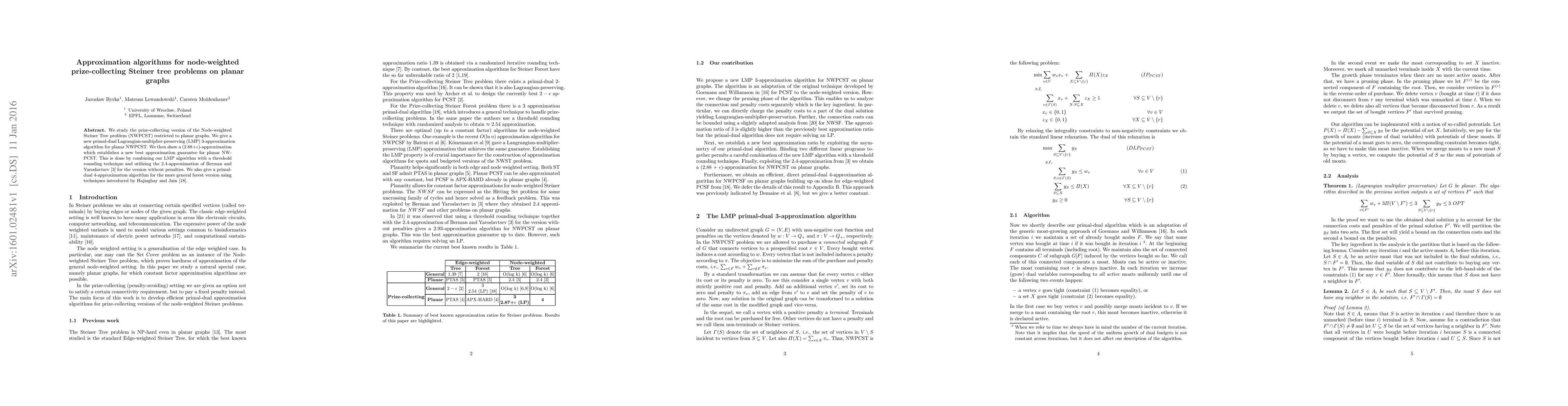 This paper presents new approximation algorithms for the Node-weighted Prize-Collecting Steiner Tree problem on planar graphs, achieving a 3-approximation using a primal-dual method and improving this to a ($2.88 + \epsilon$)-approximation through a combination of threshold rounding and existing techniques. A 4-approximation algorithm is also provided for the forest version.