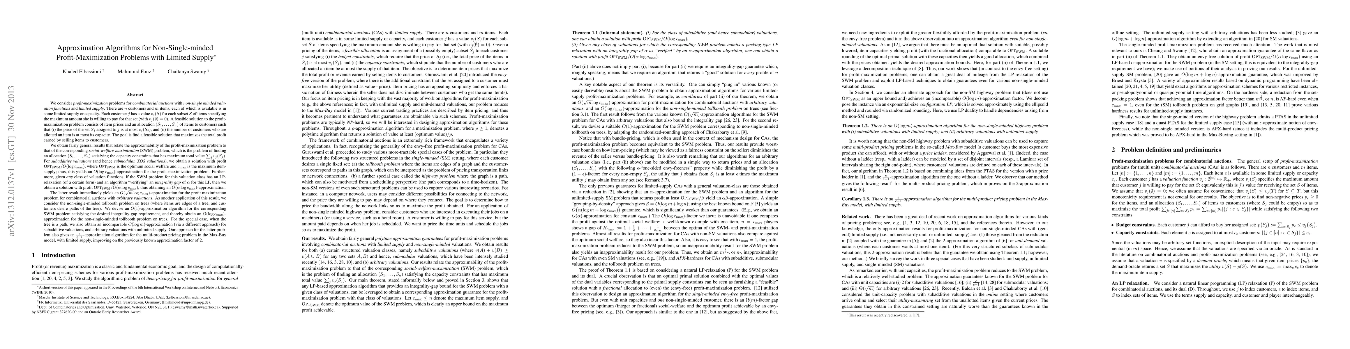 We consider {\em profit-maximization} problems for {\em combinatorial auctions} with {\em non-single minded valuation functions} and {\em limited supply}. We obtain fairly general results that relate the approximability of the profit-maximization problem to that of the corresponding {\em social-welfare-maximization} (SWM) problem, which is the problem of finding an allocation $(S_1,\ldots,S_n)$ satisfying the capacity constraints that has maximum total value $\sum_j v_j(S_j)$. For {\em subadditive valuations} (and hence {\em submodular, XOS valuations}), we obtain a solution with profit $\OPT_\swm/O(\log c_{\max})$, where $\OPT_\swm$ is the optimum social welfare and $c_{\max}$ is the maximum item-supply; thus, this yields an $O(\log c_{\max})$-approximation for the profit-maximization problem. Furthermore, given {\em any} class of valuation functions, if the SWM problem for this valuation class has an LP-relaxation (of a certain form) and an algorithm "verifying" an {\em integrality gap} of $\al$ for this LP, then we obtain a solution with profit $\OPT_\swm/O(\al\log c_{\max})$, thus obtaining an $O(\al\log c_{\max})$-approximation. For the special case, when the tree is a path, we also obtain an incomparable $O(\log m)$-approximation (via a different approach) for subadditive valuations, and arbitrary valuations with unlimited supply. Our approach for the latter problem also gives an $\frac{e}{e-1}$-approximation algorithm for the multi-product pricing problem in the Max-Buy model, with limited supply, improving on the previously known approximation factor of 2.