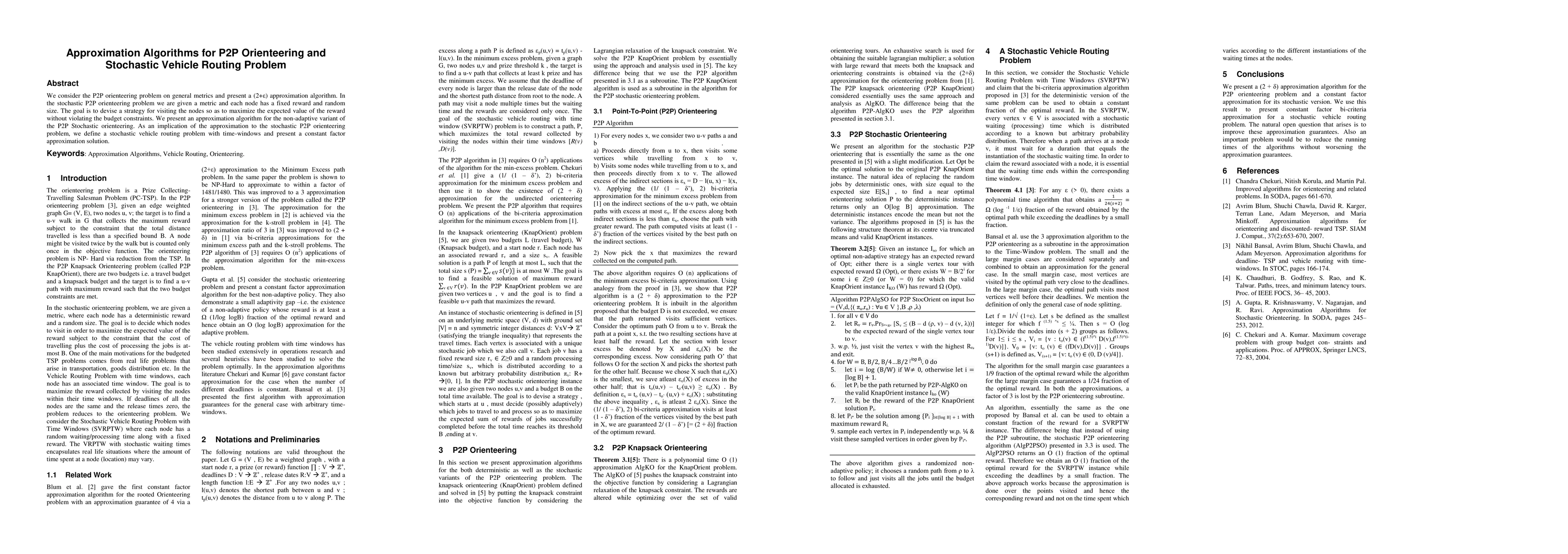 We consider the P2P orienteering problem on general metrics and present a (2+{\epsilon}) approximation algorithm. In the stochastic P2P orienteering problem we are given a metric and each node has a fixed reward and random size. The goal is to devise a strategy for visiting the nodes so as to maximize the expected value of the reward without violating the budget constraints. We present an approximation algorithm for the non-adaptive variant of the P2P Stochastic orienteering. As an implication of the approximation to the stochastic P2P orienteering problem, we define a stochastic vehicle routing problem with time-windows and present a constant factor approximation solution.
