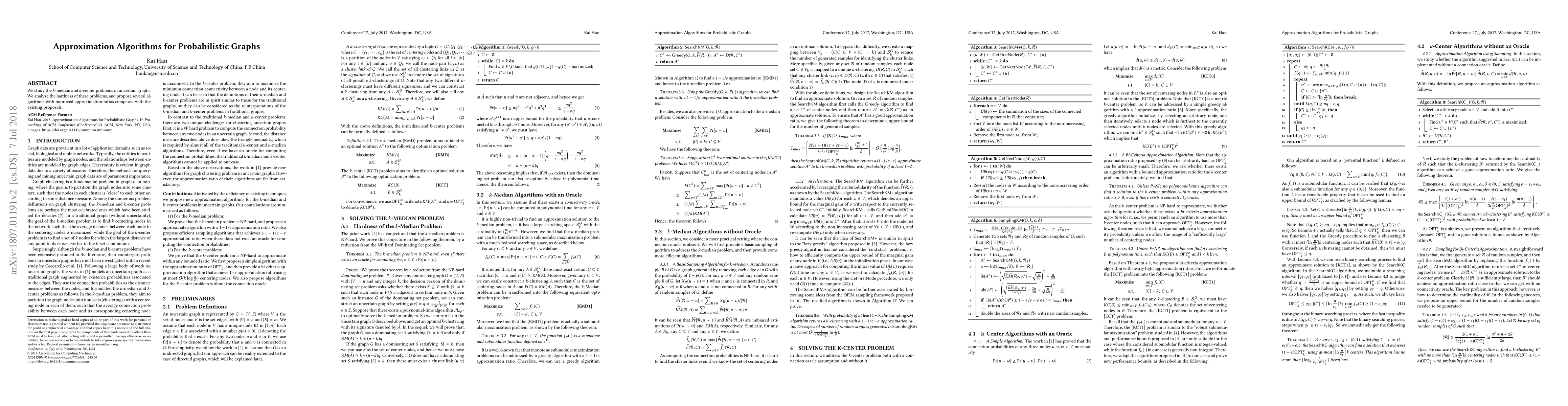 This paper investigates the k-median and k-center problems in probabilistic graphs, analyzing their computational difficulty and proposing new algorithms that achieve better approximation ratios than previous methods.