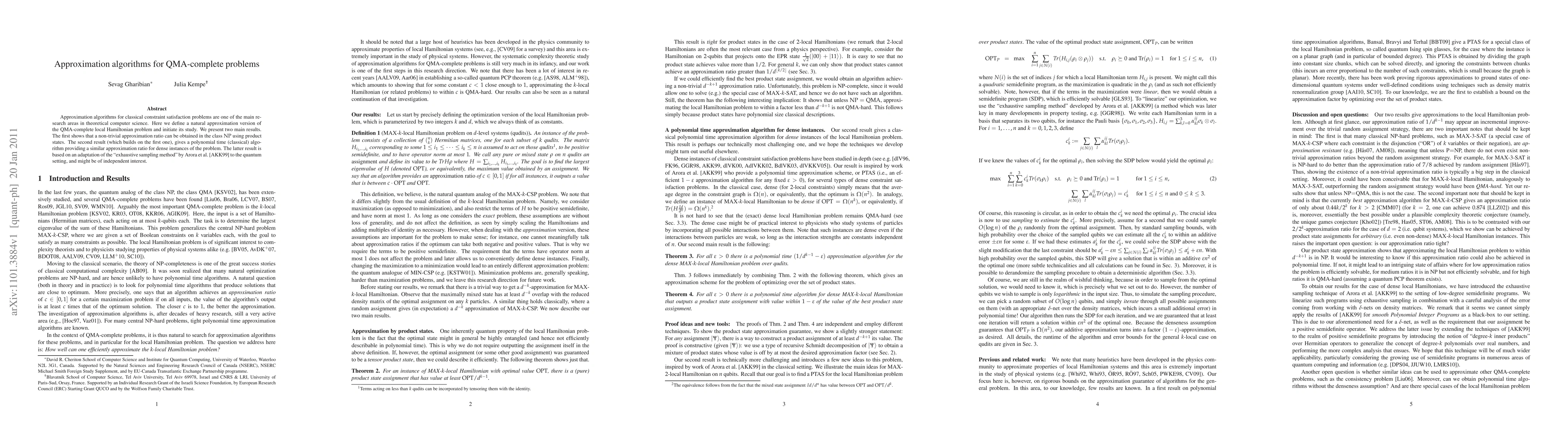 The paper introduces approximation algorithms for QMA-complete problems by defining a natural approximation version of the local Hamiltonian problem and presenting two main results: a non-trivial approximation ratio in NP using product states, and a polynomial-time classical algorithm for dense instances with a similar approximation ratio.