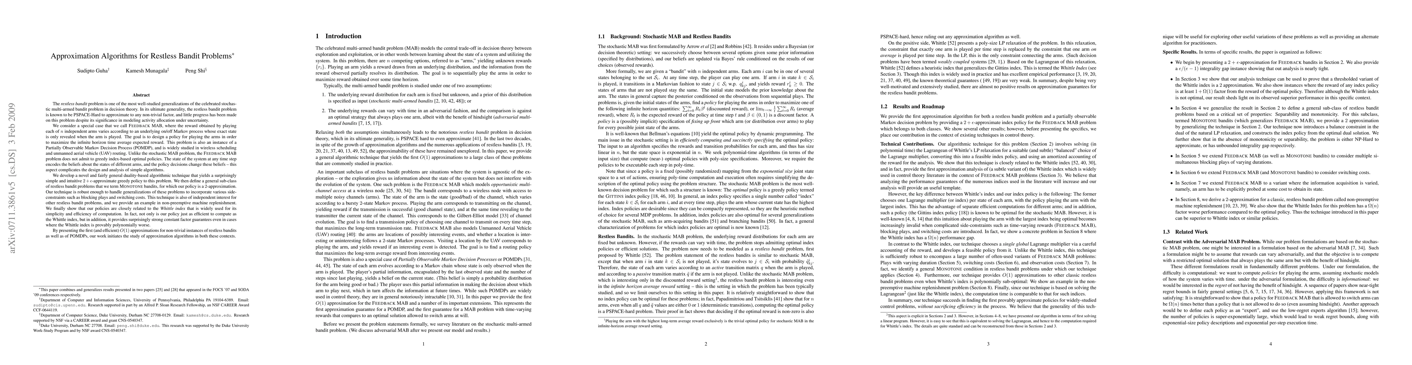 The restless bandit problem is one of the most well-studied generalizations of the celebrated stochastic multi-armed bandit problem in decision theory. In its ultimate generality, the restless bandit problem is known to be PSPACE-Hard to approximate to any non-trivial factor, and little progress has been made despite its importance in modeling activity allocation under uncertainty. We consider a special case that we call Feedback MAB, where the reward obtained by playing each of n independent arms varies according to an underlying on/off Markov process whose exact state is only revealed when the arm is played. The goal is to design a policy for playing the arms in order to maximize the infinite horizon time average expected reward. This problem is also an instance of a Partially Observable Markov Decision Process (POMDP), and is widely studied in wireless scheduling and unmanned aerial vehicle (UAV) routing. Unlike the stochastic MAB problem, the Feedback MAB problem does not admit to greedy index-based optimal policies. We develop a novel and general duality-based algorithmic technique that yields a surprisingly simple and intuitive 2+epsilon-approximate greedy policy to this problem. We then define a general sub-class of restless bandit problems that we term Monotone bandits, for which our policy is a 2-approximation. Our technique is robust enough to handle generalizations of these problems to incorporate various side-constraints such as blocking plays and switching costs. This technique is also of independent interest for other restless bandit problems. By presenting the first (and efficient) O(1) approximations for non-trivial instances of restless bandits as well as of POMDPs, our work initiates the study of approximation algorithms in both these contexts.