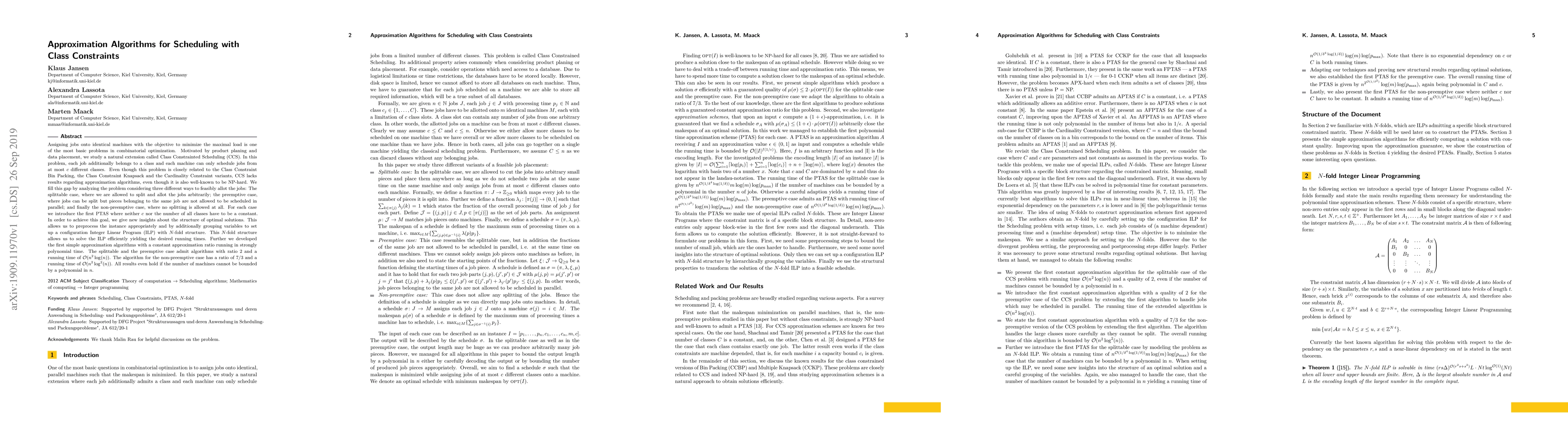 This paper develops approximation algorithms for Class Constrainted Scheduling (CCS), a problem where jobs belong to classes with machine scheduling limits, offering the first PTAS and simple approximations with constant ratios.