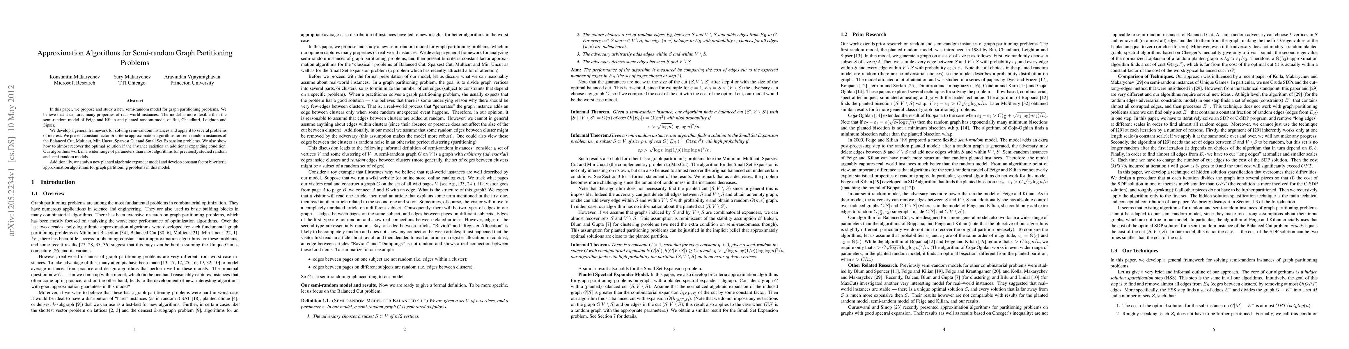 In this paper, we propose and study a new semi-random model for graph partitioning problems. We believe that it captures many properties of real--world instances. The model is more flexible than the semi-random model of Feige and Kilian and planted random model of Bui, Chaudhuri, Leighton and Sipser. We develop a general framework for solving semi-random instances and apply it to several problems of interest. We present constant factor bi-criteria approximation algorithms for semi-random instances of the Balanced Cut, Multicut, Min Uncut, Sparsest Cut and Small Set Expansion problems. We also show how to almost recover the optimal solution if the instance satisfies an additional expanding condition. Our algorithms work in a wider range of parameters than most algorithms for previously studied random and semi-random models. Additionally, we study a new planted algebraic expander model and develop constant factor bi-criteria approximation algorithms for graph partitioning problems in this model.