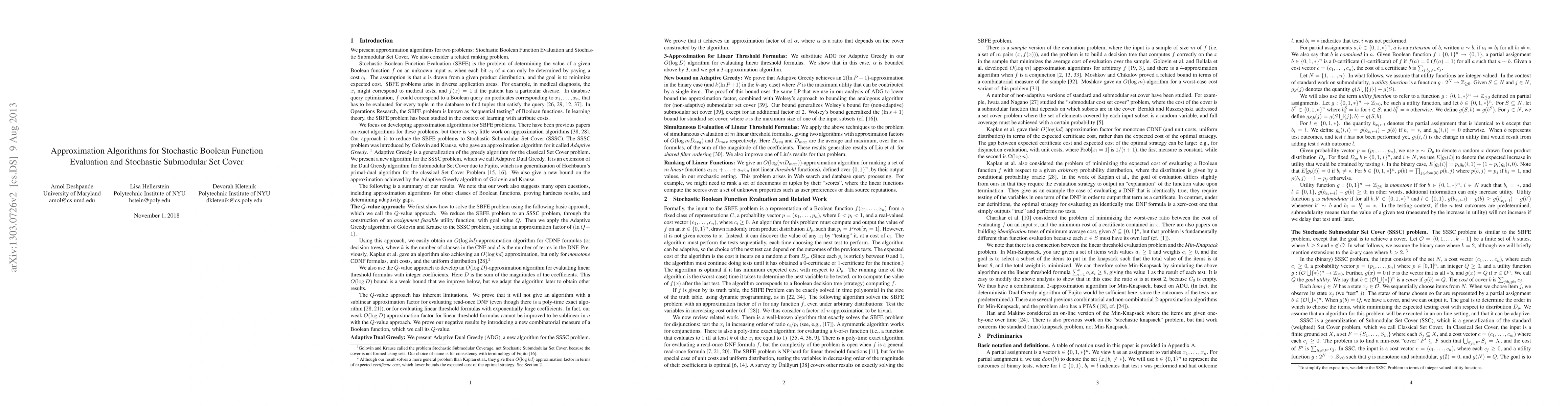 This paper develops approximation algorithms for Stochastic Boolean Function Evaluation and the Stochastic Submodular Set Cover problem. It presents a 3-approximation algorithm for Boolean linear threshold formulas and a logarithmic approximation for CDNF formulas. The key contribution is a new Adaptive Dual Greedy algorithm for SSSC, improving upon the Adaptive Greedy algorithm.