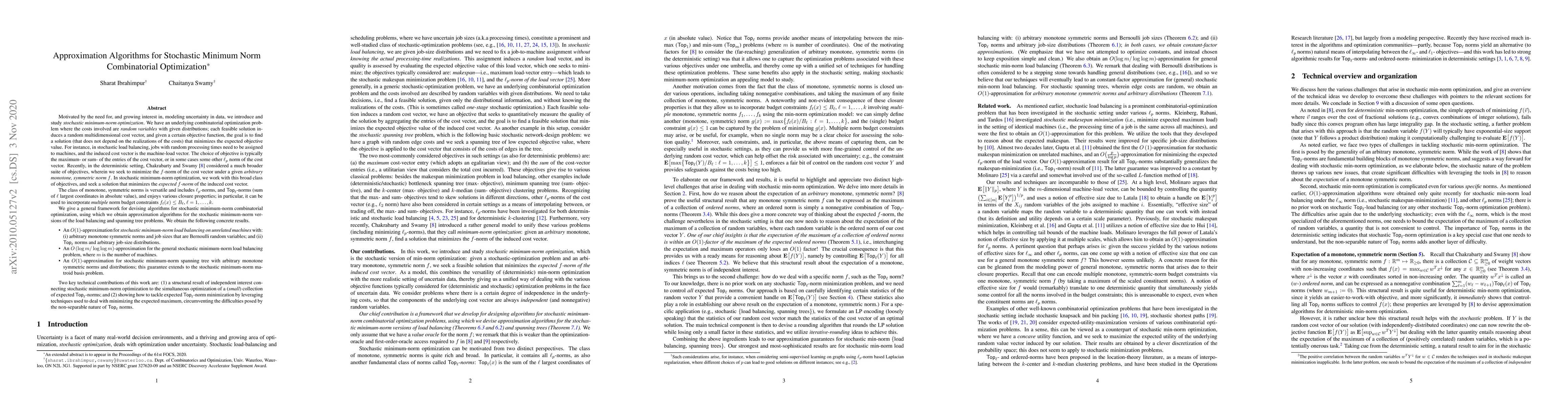 This paper introduces stochastic minimum-norm optimization, addressing combinatorial problems with random costs, and develops a framework for devising approximation algorithms. Key contributions include a structural result linking stochastic optimization to expected Top-ℓ-norms and techniques for minimizing these norms.