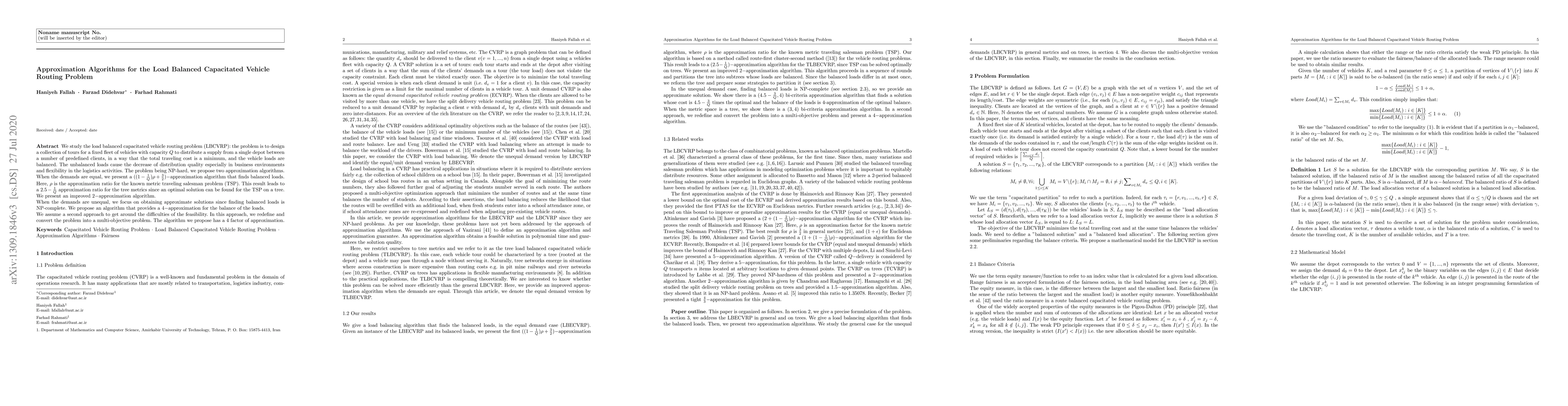 We study the load balanced capacitated vehicle routing problem (LBCVRP): the problem is to design a collection of tours for a fixed fleet of vehicles with capacity Q to distribute a supply from a single depot between a number of predefined clients, in a way that the total traveling cost is a minimum, and the vehicle loads are balanced. The unbalanced loads cause the decrease of distribution quality especially in business environments and exibility in the logistics activities. The problem being NP-hard, we propose two approximation algorithms. When the demands are equal, we present a (1-1/Q)p+3/2approximation algorithm that finds balanced loads. Here, p is the approximation ratio for the known metric traveling salesman problem (TSP). This result leads to a 2.5-1/Q approximation ratio for the tree metrics since an optimal solution can be found for the TSP on a tree. We present an improved 2 approximation algorithm. When the demands are unequal, we focus on obtaining approximate solutions since finding balanced loads is NP-complete. We propose an algorithm that provides a 4 approximation for the balance of the loads. We assume a second approach to get around the difficulties of the feasibility. In this approach, we redefine and convert the problem into a multi-objective problem. The algorithm we propose has a 4 factor of approximation.