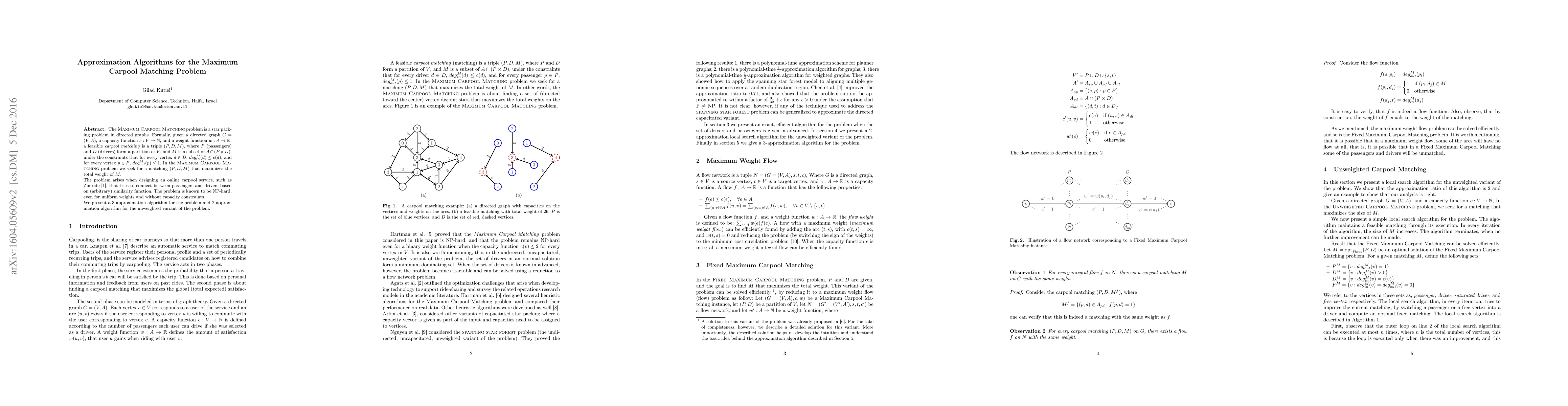 The Maximum Carpool Matching problem is a star packing problem in directed graphs. Formally, given a directed graph $G = (V, A)$, a capacity function $ c: V \to N $, and a weight function $w : A \to R $, a feasible \emph{carpool matching} is a triple $(P, D, M)$, where $P$ (passengers) and $D$ (drivers) form a partition of $V$, and $M$ is a subset of $A \cap (P \times D)$, under the constraints that for every vertex $d \in D$, $din(d) \leq c(d)$, and for every vertex $p \in P$, $dout(p) \leq 1$. In the Maximum Carpool Matching problem we seek for a matching $(P, D, M)$ that maximizes the total weight of $M$. The problem arises when designing an online carpool service, such as Zimride~\cite{zimride}, that tries to connect between passengers and drivers based on (arbitrary) similarity function. The problem is known to be NP-hard, even for uniform weights and without capacity constraints. We present a $3$-approximation algorithm for the problem and $2$-approximation algorithm for the unweighted variant of the problem.