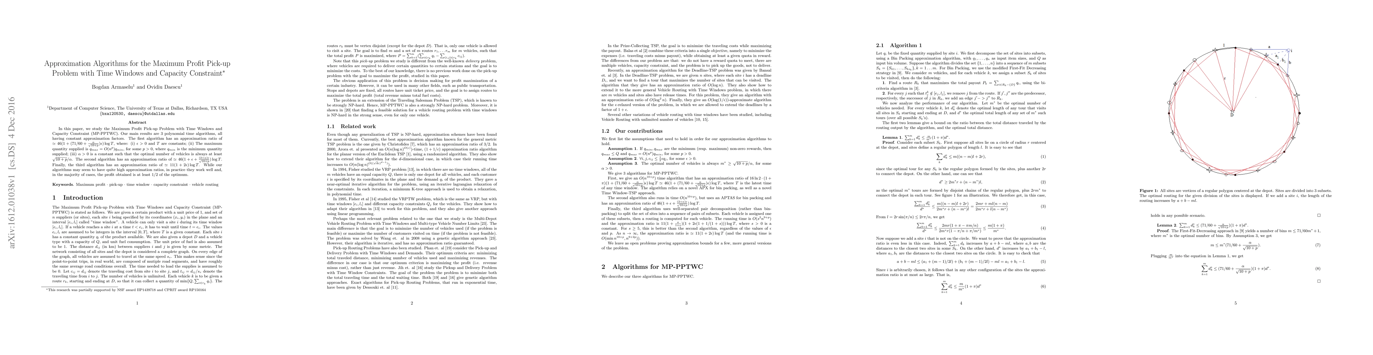 In this paper, we study the Maximum Profit Pick-up Problem with Time Windows and Capacity Constraint (MP-PPTWC). Our main results are 3 polynomial time algorithms, all having constant approximation factors. The first algorithm has an approximation ratio of $~46 (1 + (71/60 + \frac{\alpha}{\sqrt{10+p}}) \epsilon) \log T$, where: (i) $\epsilon > 0$ and $T$ are constants; (ii) The maximum quantity supplied is $q_{max} = O(n^p) q_{min}$, for some $p > 0$, where $q_{min}$ is the minimum quantity supplied; (iii) $\alpha > 0$ is a constant such that the optimal number of vehicles is always at least $\sqrt{10 + p} / \alpha$. The second algorithm has an approximation ratio of $\simeq 46 (1 + \epsilon + \frac{(2 + \alpha) \epsilon}{\sqrt{10 + p}}) \log T$. Finally, the third algorithm has an approximation ratio of $\simeq 11 (1 + 2 \epsilon) \log T$. While our algorithms may seem to have quite high approximation ratios, in practice they work well and, in the majority of cases, the profit obtained is at least 1/2 of the optimum.