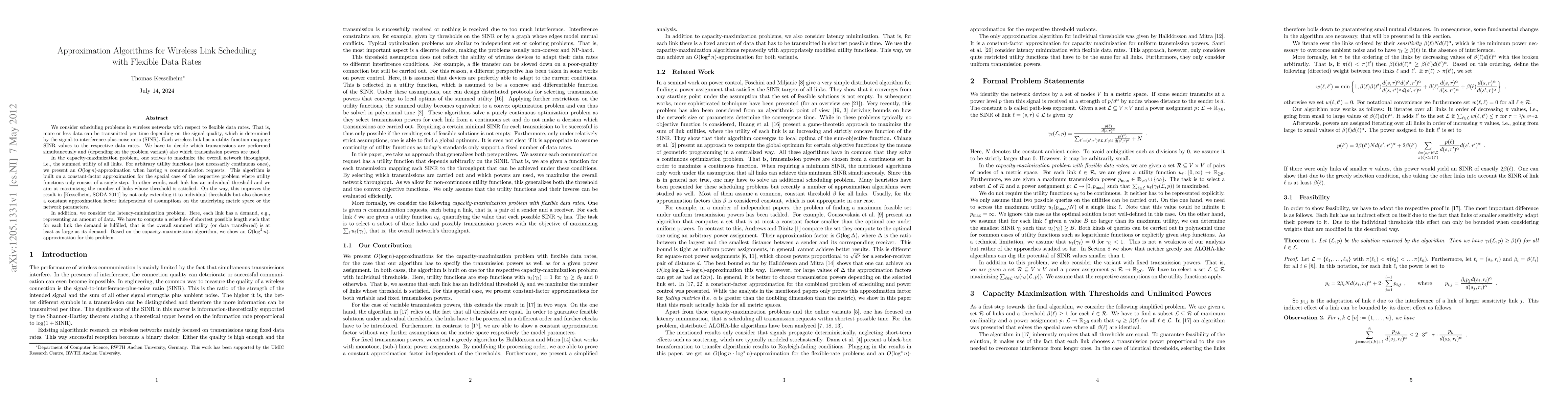 We consider scheduling problems in wireless networks with respect to flexible data rates. That is, more or less data can be transmitted per time depending on the signal quality, which is determined by the signal-to-interference-plus-noise ratio (SINR). Each wireless link has a utility function mapping SINR values to the respective data rates. We have to decide which transmissions are performed simultaneously and (depending on the problem variant) also which transmission powers are used. In the capacity-maximization problem, one strives to maximize the overall network throughput, i.e., the summed utility of all links. For arbitrary utility functions (not necessarily continuous ones), we present an O(log n)-approximation when having n communication requests. This algorithm is built on a constant-factor approximation for the special case of the respective problem where utility functions only consist of a single step. In other words, each link has an individual threshold and we aim at maximizing the number of links whose threshold is satisfied. On the way, this improves the result in [Kesselheim, SODA 2011] by not only extending it to individual thresholds but also showing a constant approximation factor independent of assumptions on the underlying metric space or the network parameters. In addition, we consider the latency-minimization problem. Here, each link has a demand, e.g., representing an amount of data. We have to compute a schedule of shortest possible length such that for each link the demand is fulfilled, that is the overall summed utility (or data transferred) is at least as large as its demand. Based on the capacity-maximization algorithm, we show an O(log^2 n)-approximation for this problem.