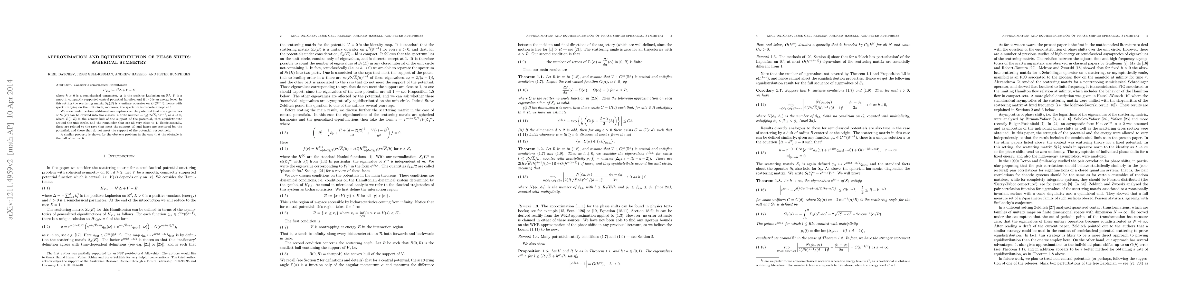 Researchers show that for a specific type of quantum Hamiltonian, eigenvalues of its scattering matrix can be divided into two classes: those that equidistribute around the unit circle as the semiclassical parameter approaches zero, and those close to 1, related to rays scattered or not by the potential.