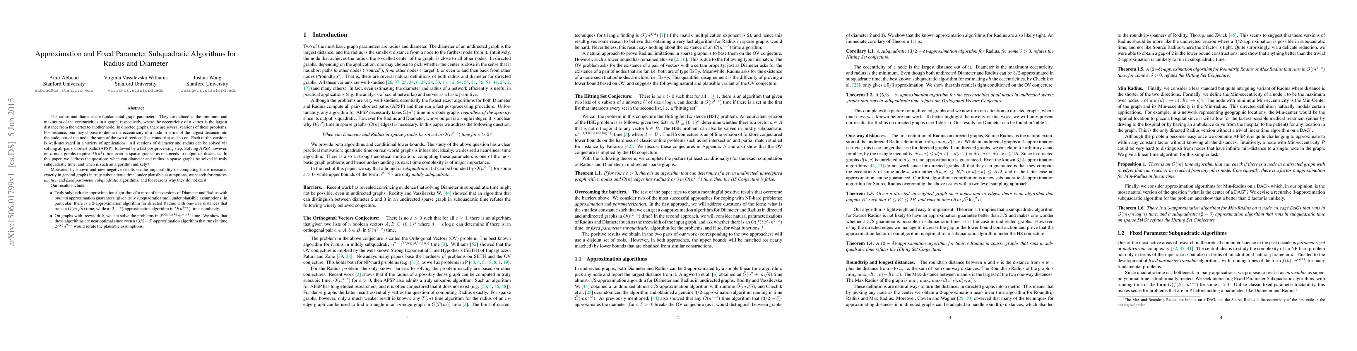 The radius and diameter are fundamental graph parameters. They are defined as the minimum and maximum of the eccentricities in a graph, respectively, where the eccentricity of a vertex is the largest distance from the vertex to another node. In directed graphs, there are several versions of these problems. For instance, one may choose to define the eccentricity of a node in terms of the largest distance into the node, out of the node, the sum of the two directions (i.e. roundtrip) and so on. All versions of diameter and radius can be solved via solving all-pairs shortest paths (APSP), followed by a fast postprocessing step. Solving APSP, however, on $n$-node graphs requires $\Omega(n^2)$ time even in sparse graphs, as one needs to output $n^2$ distances. Motivated by known and new negative results on the impossibility of computing these measures exactly in general graphs in truly subquadratic time, under plausible assumptions, we search for \emph{approximation} and \emph{fixed parameter subquadratic} algorithms, and for reasons why they do not exist. Our results include: - Truly subquadratic approximation algorithms for most of the versions of Diameter and Radius with \emph{optimal} approximation guarantees (given truly subquadratic time), under plausible assumptions. In particular, there is a $2$-approximation algorithm for directed Radius with one-way distances that runs in $\tilde{O}(m\sqrt{n})$ time, while a $(2-\delta)$-approximation algorithm in $O(n^{2-\epsilon})$ time is unlikely. - On graphs with treewidth $k$, we can solve the problems in $2^{O(k\log{k})}n^{1+o(1)}$ time. We show that these algorithms are near optimal since even a $(3/2-\delta)$-approximation algorithm that runs in time $2^{o(k)}n^{2-\epsilon}$ would refute the plausible assumptions.