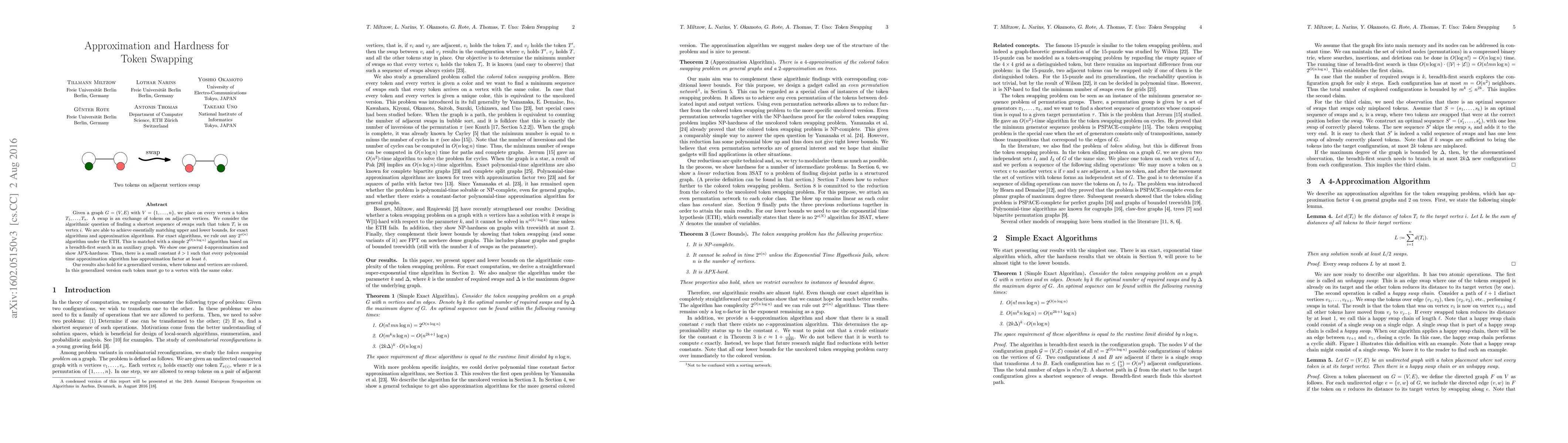 Given a graph $G=(V,E)$ with $V=\{1,\ldots,n\}$, we place on every vertex a token $T_1,\ldots,T_n$. A swap is an exchange of tokens on adjacent vertices. We consider the algorithmic question of finding a shortest sequence of swaps such that token $T_i$ is on vertex $i$. We are able to achieve essentially matching upper and lower bounds, for exact algorithms and approximation algorithms. For exact algorithms, we rule out any $2^{o(n)}$ algorithm under the ETH. This is matched with a simple $2^{O(n\log n)}$ algorithm based on a breadth-first search in an auxiliary graph. We show one general $4$-approximation and show APX-hardness. Thus, there is a small constant $\delta>1$ such that every polynomial time approximation algorithm has approximation factor at least $\delta$. Our results also hold for a generalized version, where tokens and vertices are colored. In this generalized version each token must go to a vertex with the same color.