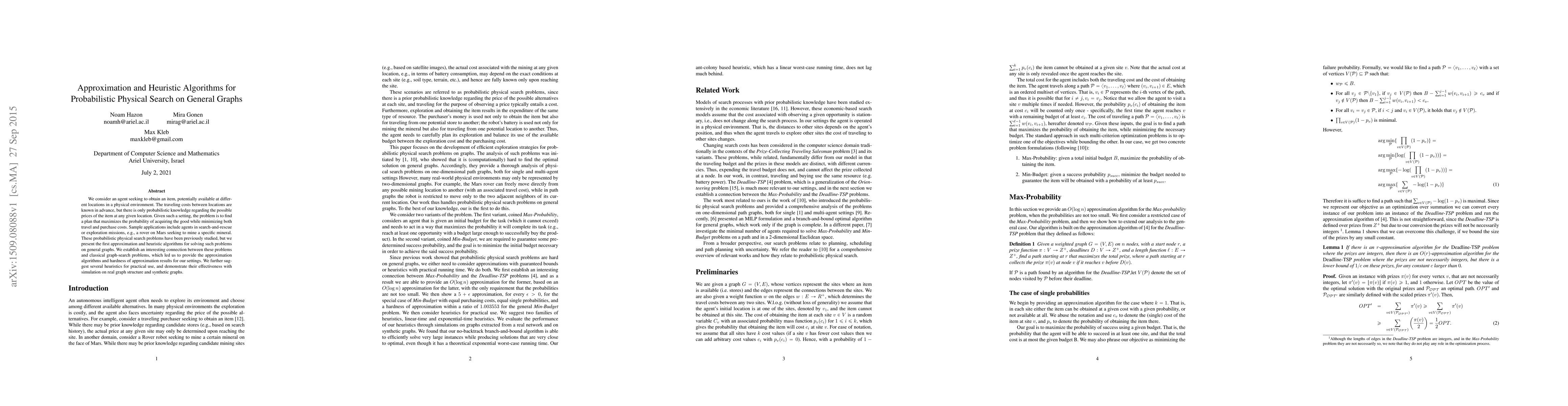 This paper introduces approximation and heuristic algorithms for solving probabilistic physical search problems on general graphs, where an agent seeks to maximize the probability of acquiring an item while minimizing travel and purchase costs. The authors establish connections to classical graph-search problems and demonstrate the effectiveness of their proposed methods through simulations.