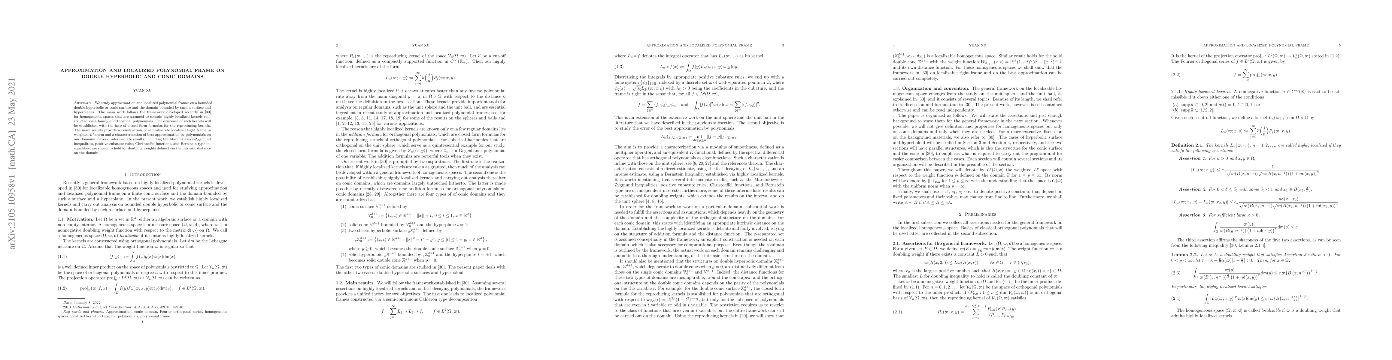 This paper explores approximation and localized polynomial frames on double hyperbolic and conic domains, providing a semi-discrete tight frame in weighted L^2 norm and characterizing best polynomial approximation.