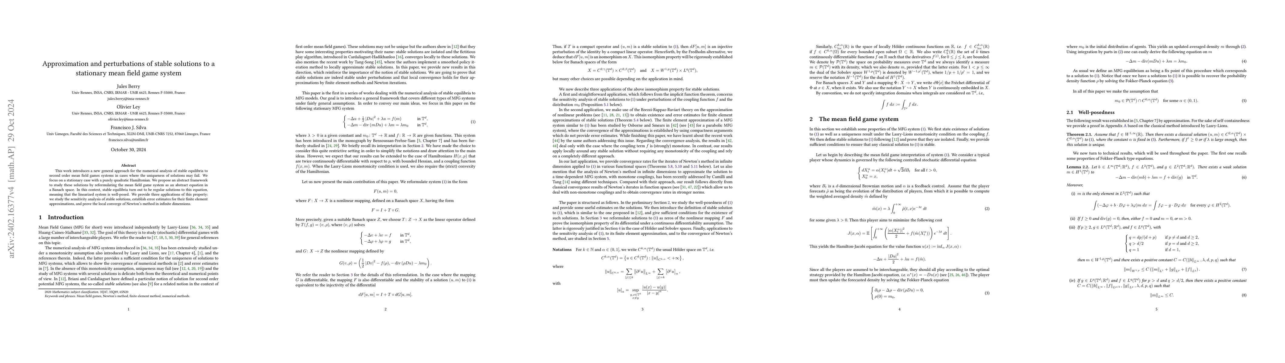 This paper develops a novel framework for analyzing stable equilibria in mean field game systems, focusing on stationary cases where solutions may not be unique. It reformulates the system as an abstract equation in Banach space, facilitating sensitivity analysis, finite element approximation error estimates, and proving the local convergence of Newton's method.