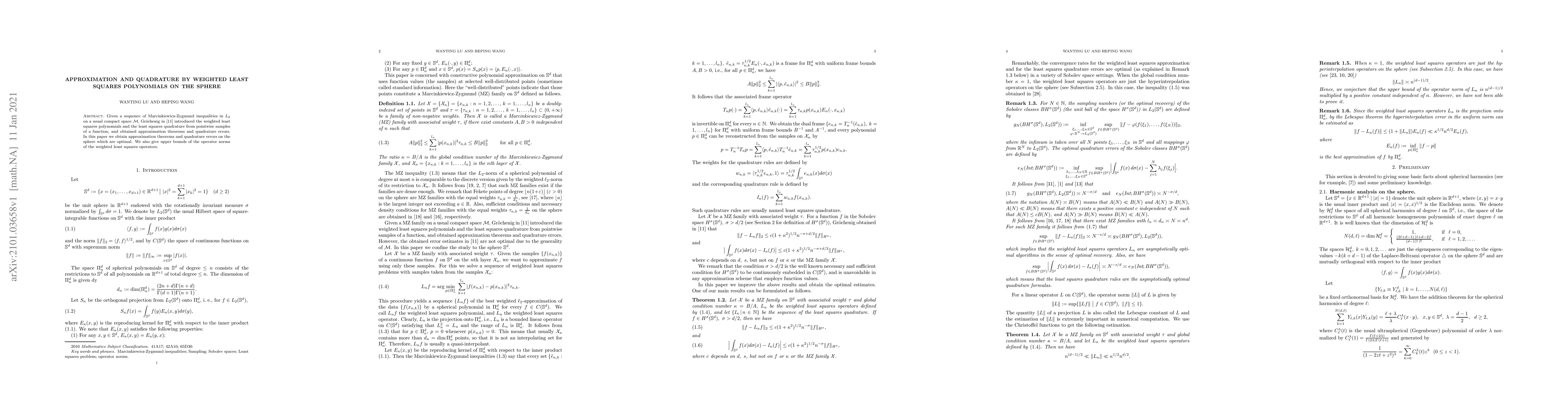 Given a sequence of Marcinkiewicz-Zygmund inequalities in $L_2$ on a usual compact space $\mathcal M$, Gr\"ochenig introduced the weighted least squares polynomials and the least squares quadrature from pointwise samples of a function, and obtained approximation theorems and quadrature errors. In this paper we obtain approximation theorems and quadrature errors on the sphere which are optimal. We also give upper bounds of the operator norms of the weighted least squares operators.