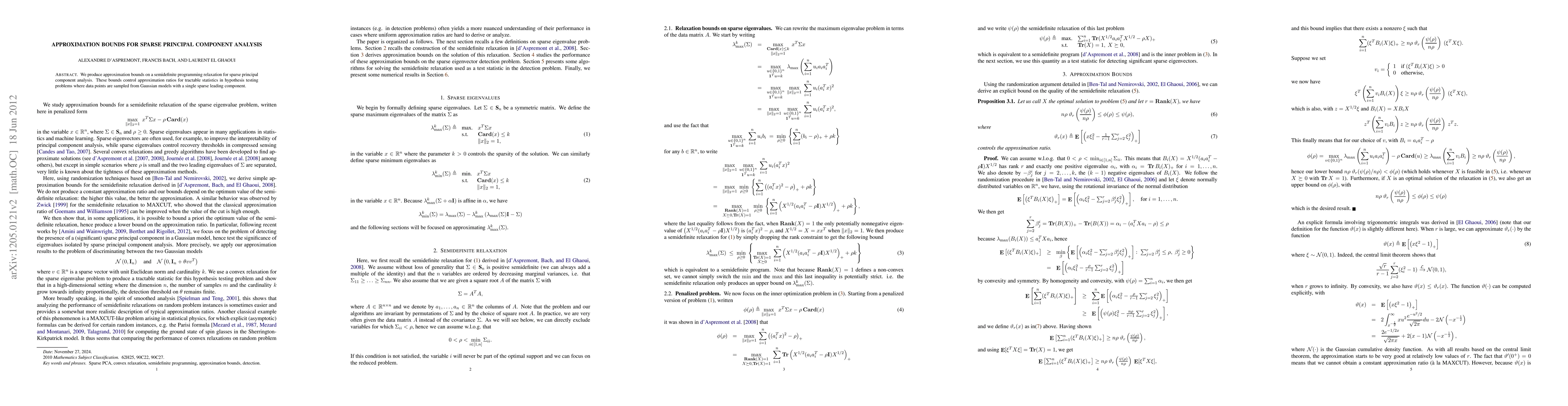 Summary: This paper establishes approximation bounds for a semidefinite programming relaxation in sparse principal component analysis, providing control over approximation ratios in hypothesis testing for Gaussian models with a single sparse leading component.