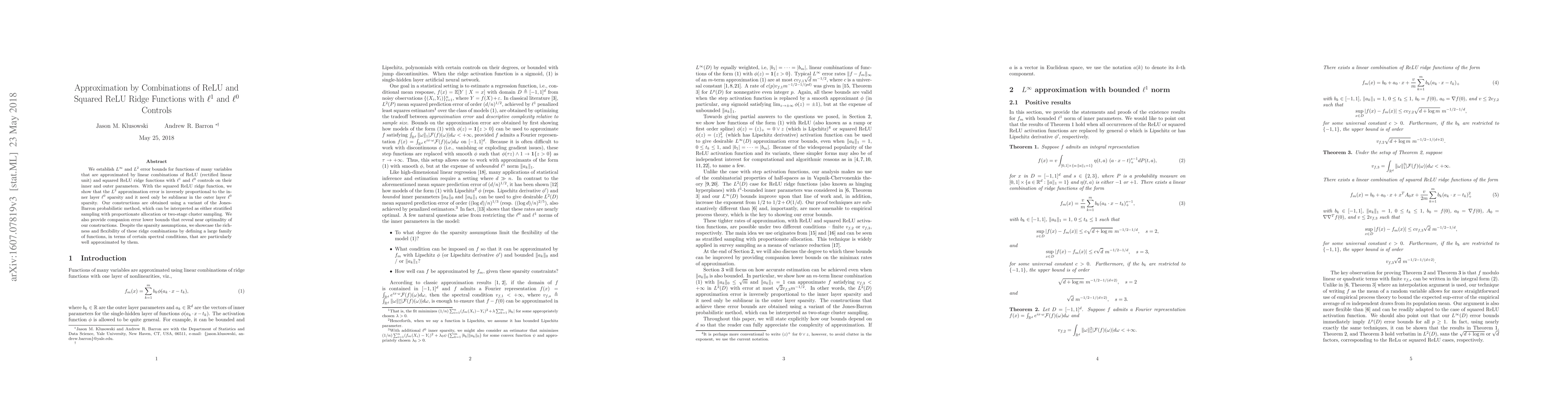 We establish $ L^{\infty} $ and $ L^2 $ error bounds for functions of many variables that are approximated by linear combinations of ReLU (rectified linear unit) and squared ReLU ridge functions with $ \ell^1 $ and $ \ell^0 $ controls on their inner and outer parameters. With the squared ReLU ridge function, we show that the $ L^2 $ approximation error is inversely proportional to the inner layer $ \ell^0 $ sparsity and it need only be sublinear in the outer layer $ \ell^0 $ sparsity. Our constructions are obtained using a variant of the Jones-Barron probabilistic method, which can be interpreted as either stratified sampling with proportionate allocation or two-stage cluster sampling. We also provide companion error lower bounds that reveal near optimality of our constructions. Despite the sparsity assumptions, we showcase the richness and flexibility of these ridge combinations by defining a large family of functions, in terms of certain spectral conditions, that are particularly well approximated by them.