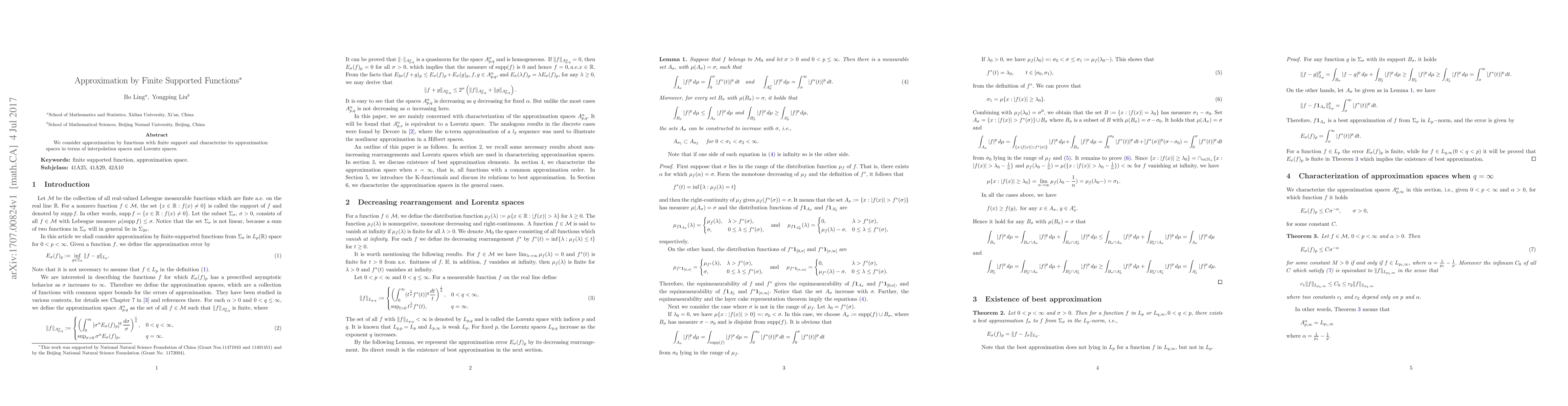 We consider approximation by functions with finite support and characterize its approximation spaces in terms of interpolation spaces and Lorentz spaces.