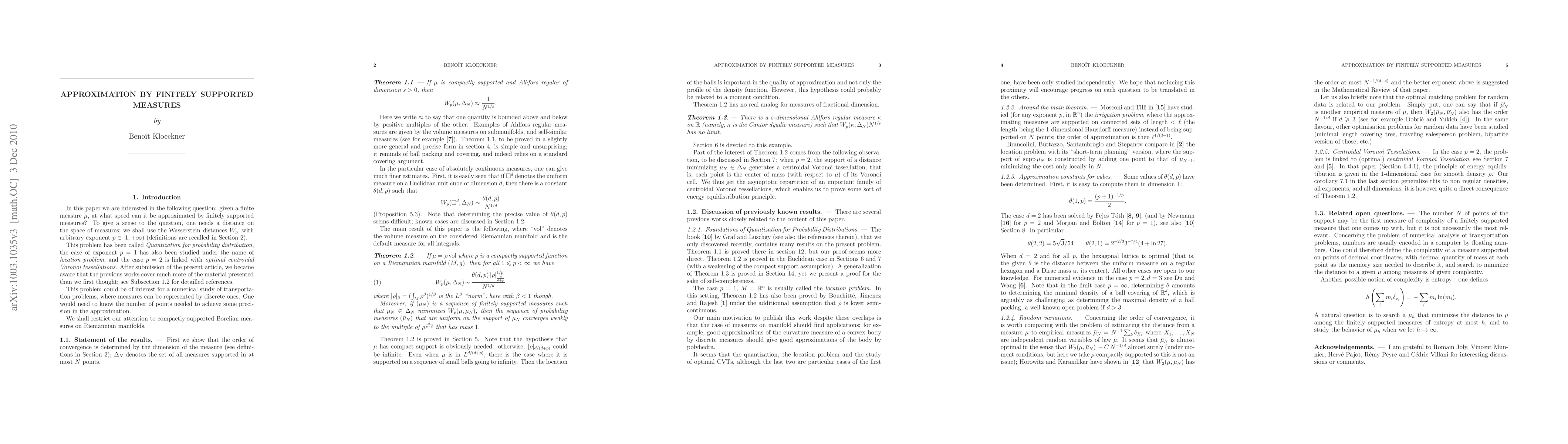 Given a compactly supported probability measure on a Riemannian manifold, we study the asymptotic speed at which it can be approximated (in Wasserstein distance of any exponent p) by finitely supported measure. This question has been studied under the names of ``quantization of distributions'' and, when p=1, ``location problem''. When p=2, it is linked with Centroidal Voronoi Tessellations.
