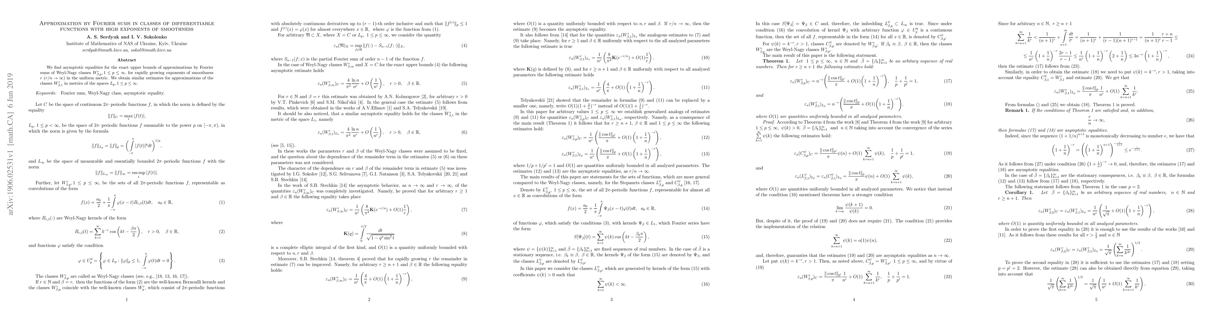 The paper finds asymptotic equalities for approximations of high-smoothness functions by Fourier sums in various classes, including Weyl-Nagy classes and $L_p$ spaces.