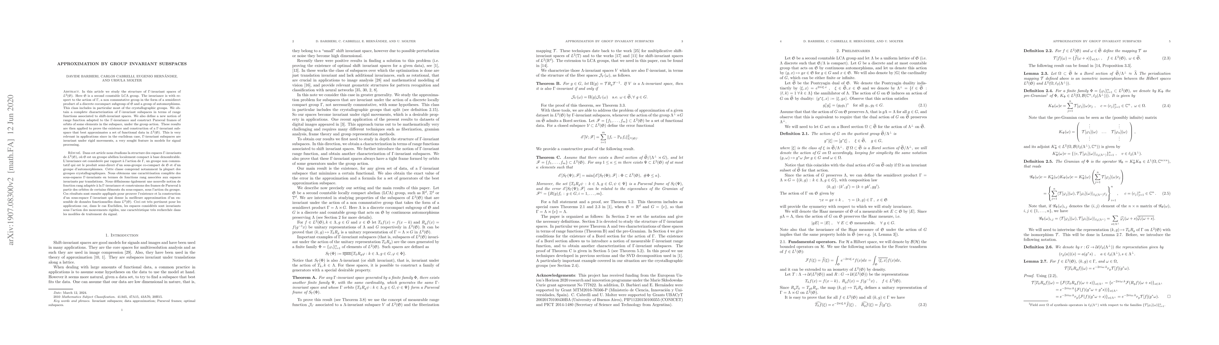 In this article we study the structure of $\Gamma$-invariant spaces of $L^2(\bf R)$. Here $\bf R$ is a second countable LCA group. The invariance is with respect to the action of $\Gamma$, a non commutative group in the form of a semidirect product of a discrete cocompact subgroup of $\bf R$ and a group of automorphisms. This class includes in particular most of the crystallographic groups. We obtain a complete characterization of $\Gamma$-invariant subspaces in terms of range functions associated to shift-invariant spaces. We also define a new notion of range function adapted to the $\Gamma$-invariance and construct Parseval frames of orbits of some elements in the subspace, under the group action. These results are then applied to prove the existence and construction of a $\Gamma$-invariant subspace that best approximates a set of functional data in $L^2(\bf R)$. This is very relevant in applications since in the euclidean case, $\Gamma$-invariant subspaces are invariant under rigid movements, a very sought feature in models for signal processing.