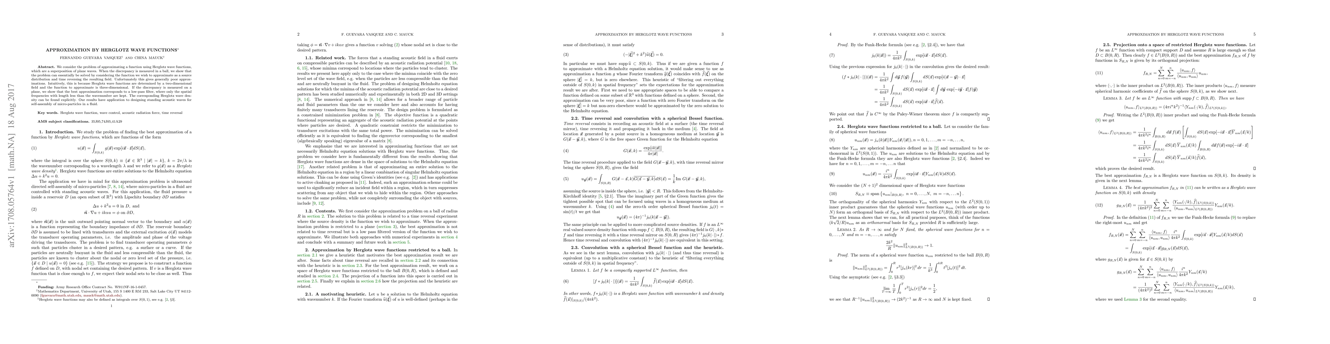 Researchers develop a method to approximate functions using Herglotz wave functions, finding that best approximations occur when only low spatial frequencies are kept, with applications in designing standing acoustic waves for micro-particle assembly.