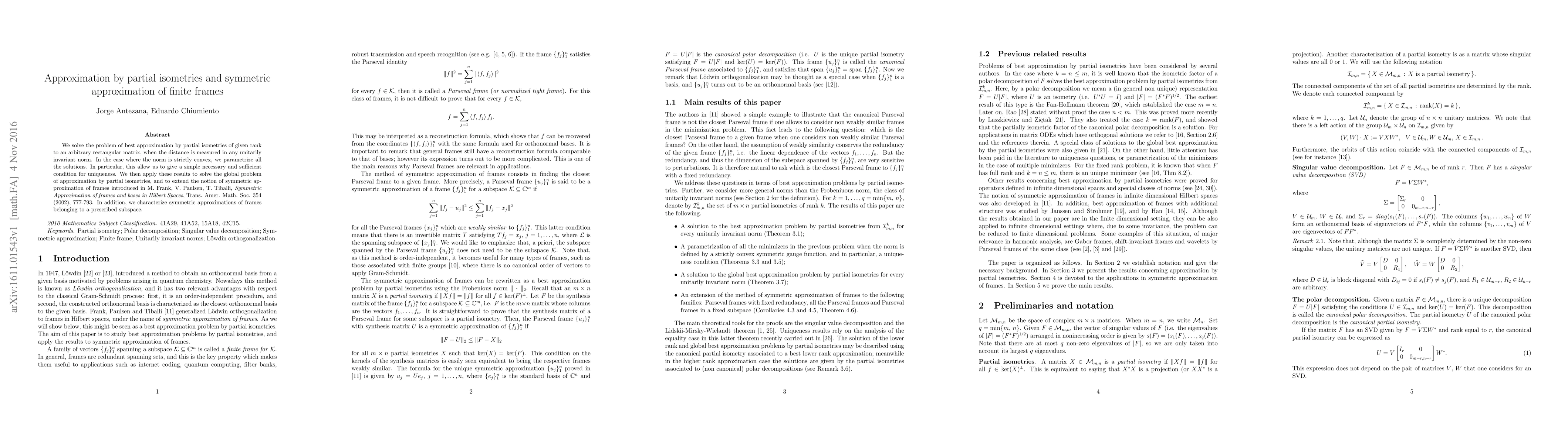 This paper addresses the best approximation of rectangular matrices by partial isometries of given rank, providing a characterization of solutions under strictly convex norms and a condition for uniqueness. It extends symmetric approximation of frames to a broader context, including characterizations of symmetric approximations within prescribed subspaces.