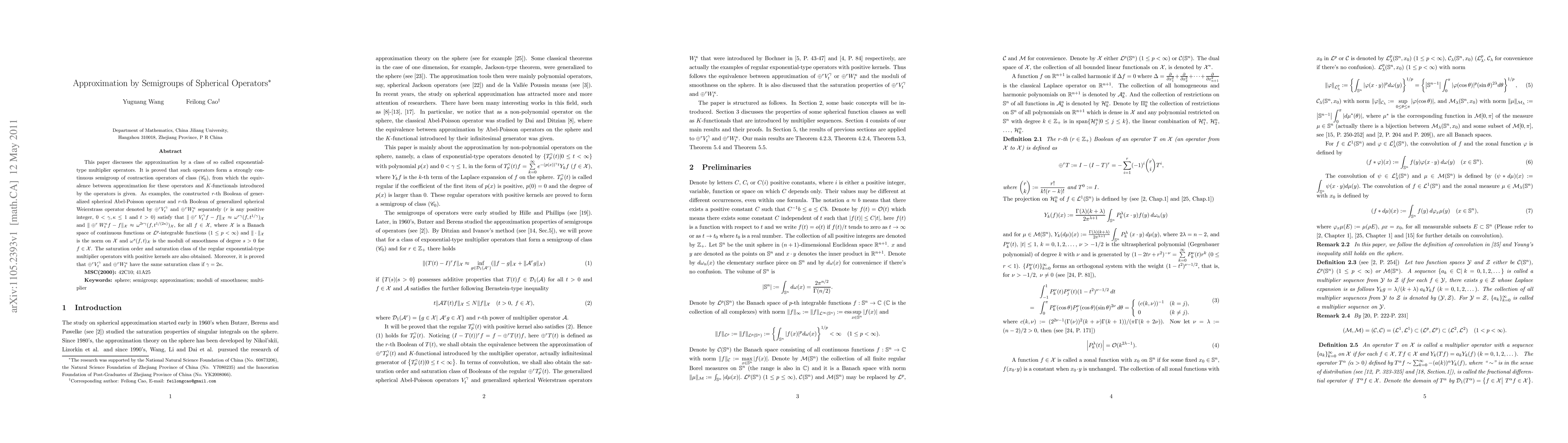 This paper discusses the approximation by %semigroups of operators of class ($\mathscr{C}_0$) on the sphere and focuses on a class of so called exponential-type multiplier operators. It is proved that such operators form a strongly continuous semigroup of contraction operators of class ($\mathscr{C}_0$), from which the equivalence between approximation for these operators and $K$-functionals introduced by the operators is given. As examples, the constructed $r$-th Boolean of generalized spherical Abel-Poisson operator and $r$-th Boolean of generalized spherical Weierstrass operator denoted by $\oplus^r V_t^{\gamma}$ and $\oplus^r W_t^{\kappa}$ separately ($r$ is any positive integer, $0<\gamma,\kappa\leq1$ and $t>0$) satisfy that $\|\oplus^r V_t^{\gamma}f - f\|_{\mathcal{X}}\approx \omega^{r\gamma}(f,t^{1/\gamma})_{\mathcal{X}}$ and $\|\oplus^r W_t^{\kappa}f - f\|_{\mathcal{X}}\approx \omega^{2r\gamma}(f,t^{1/(2\kappa)})_{\mathcal{X}}$, for all $f\in \mathcal{X}$, where $\mathcal{X}$ is a Banach space of continuous functions or $\mathcal{L}^p$-integrable functions ($1\leq p<\infty$) and $\|\cdot\|_{\mathcal{X}}$ is the norm on $\mathcal{X}$ and $\omega^s(f,t)_{\mathcal{X}}$ is the moduli of smoothness of degree $s>0$ for $f\in \mathcal{X}$. The saturation order and saturation class of the regular exponential-type multiplier operators with positive kernels are also obtained. Moreover, it is proved that $\oplus^r V_t^{\gamma}$ and $\oplus^r W_t^{\kappa}$ have the same saturation class if $\gamma=2\kappa$.