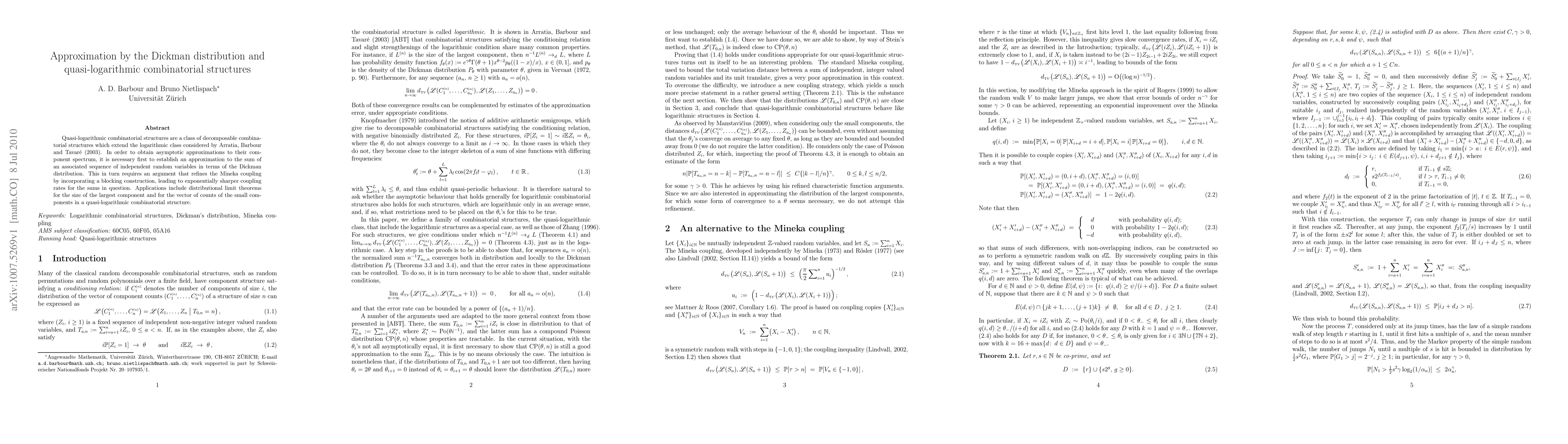 This paper explores the use of the Dickman distribution to approximate the sum of independent random variables in quasi-logarithmic combinatorial structures, refining the Mineka coupling with a blocking construction for sharper coupling rates. Applications include limit theorems for the largest component size and small component counts.