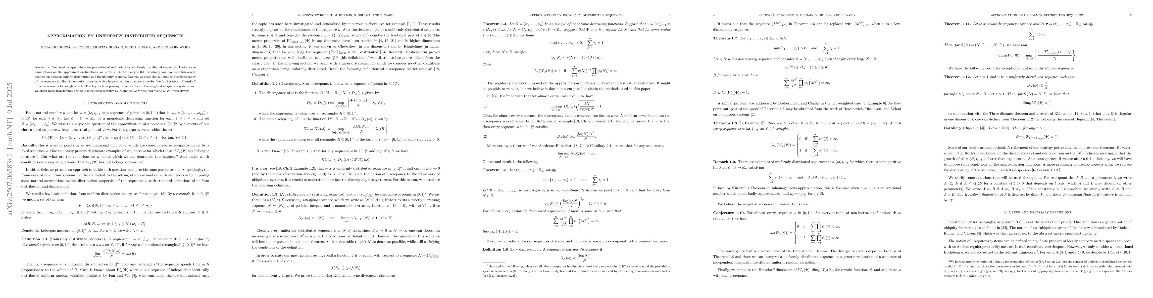 We consider approximation properties of real points by uniformly distributed sequences. Under some assumptions on the approximation functions, we prove a Khintchine-type $0$-$1$ dichotomy law. We establish a new connection between uniform distribution and the ubiquity property. Namely, we show that a bound on the discrepancy of the sequence implies the ubiquity property, which helps to obtain divergence results. We further obtain Hausdorff dimension results for weighted sets. The key tools in proving these results are the weighted ubiquitous systems and weighted mass transference principle introduced recently by Kleinbock \& Wang, and Wang \& Wu respectively.